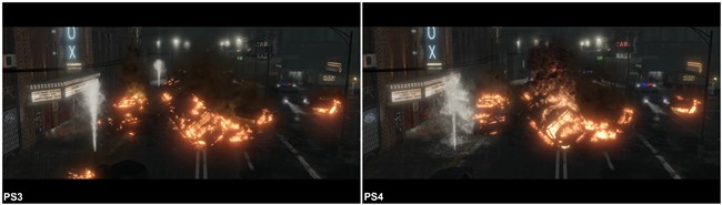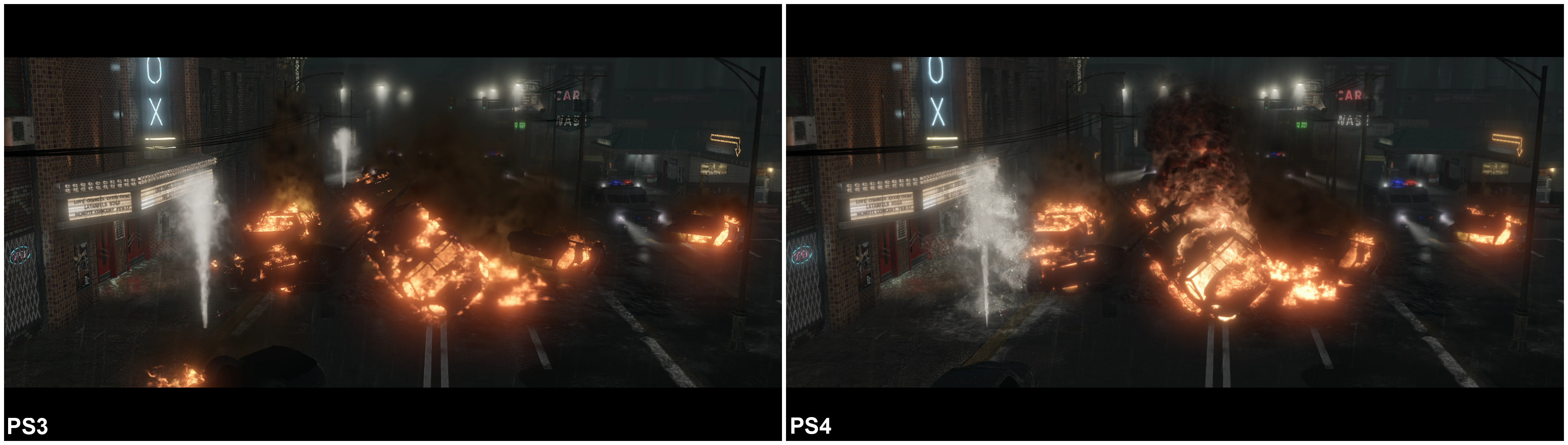 Αναβαθμίζονται και ορισμένα εφέ διαφάνειας. Η σκηνή αυτή εκτυλίσσεται με διαφόρους τρόπους, αλλά στο PS4 βλέπουμε ποιοτικότερο ψεκασμένο νερό από τον πυροσβεστικό κουρνό (αριστερά), αλλά και μεγαλύτερο σύννεφο καπνού σε απόσταση (κέντρο).