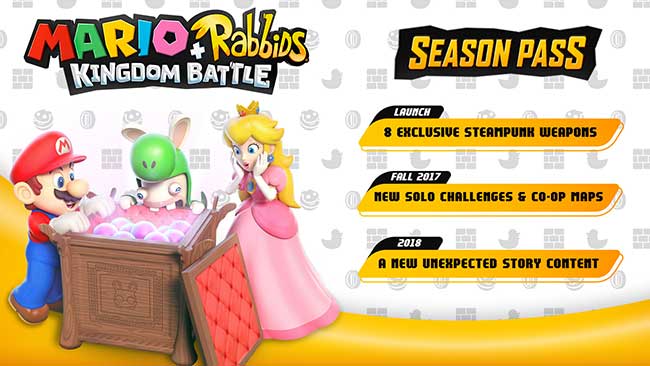 Η Ubisoft ανακοίνωσε το Season Pass για το Mario + Rabbids Kingdom Battle το οποίο θα περιέχει νέα όπλα, co-op χάρτες, single player αποστολές και θα εμβαθύνει ακόμα περισσότερο στην ιστορία του παιχνιδιού. Η τιμή του θα ανέρχεται στα 19,99 ευρώ και θα περιλαμβάνει oκτώ μοναδικά όπλα με steampunk αισθητική, το καθένα με τις δικές του ιδιότητες, θα είναι διαθέσιμα στο launch του παιχνιδιού και θα είναι αποκλειστικά για τους κατόχους του Season Pass. Επίσης, νέοι χάρτες για solo και co-op προκλήσεις, θα είναι διαθέσιμοι το φθινόπωρο, καθώς και νέο περιεχόμενο στο story-driven campaign θα διατεθούν το 2018. Ο τίτλος θα κυκλοφορήσει αποκλειστικά για Nintendo Switch στις 29 Αυγούστου.