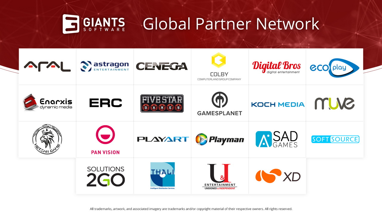 Με τη δημιουργία ενός παγκόσμιου δικτύου συνεργατών, η GIANTS Software όχι μόνο αυξάνει την επιρροή και την αναγνωρισιμότητα του brand της σε όλο τον κόσμο, αλλά και την ανεξαρτησία της ως εκδοτική εταιρία παιχνιδιών που αναπτύχθηκε για να γίνει αυτόνομη. Είκοσι δύο συνεργάτες έχουν ήδη αποφασίσει να ακολουθήσουν την εταιρία σε αυτό το εγχείρημα – και ο αριθμός τους αυξάνει: