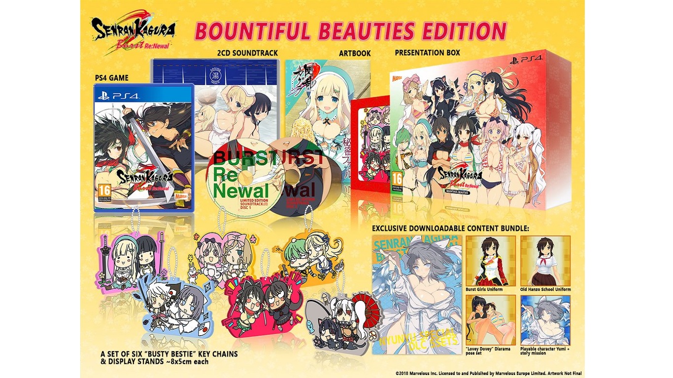 - Η Marvelous Europe ανακοίνωσε ότι το Senran Kagura Burst Re:Newal θα καταφτάσει στα ευρωπαϊκά PlayStation 4, ενώ ήταν άκρως αποκαλυπτική για τα καλούδια τα οποία θα φέρουν η φυσική collector's edition και η digital deluxe. Η Senran Kagura Burst Re:Newal – Bountiful Beauties Edition θα είναι διαθέσιμη αποκλειστικά μέσω του Marvelous Europe Store, έναντι £79,99 και θα περιέχει τα εξής: