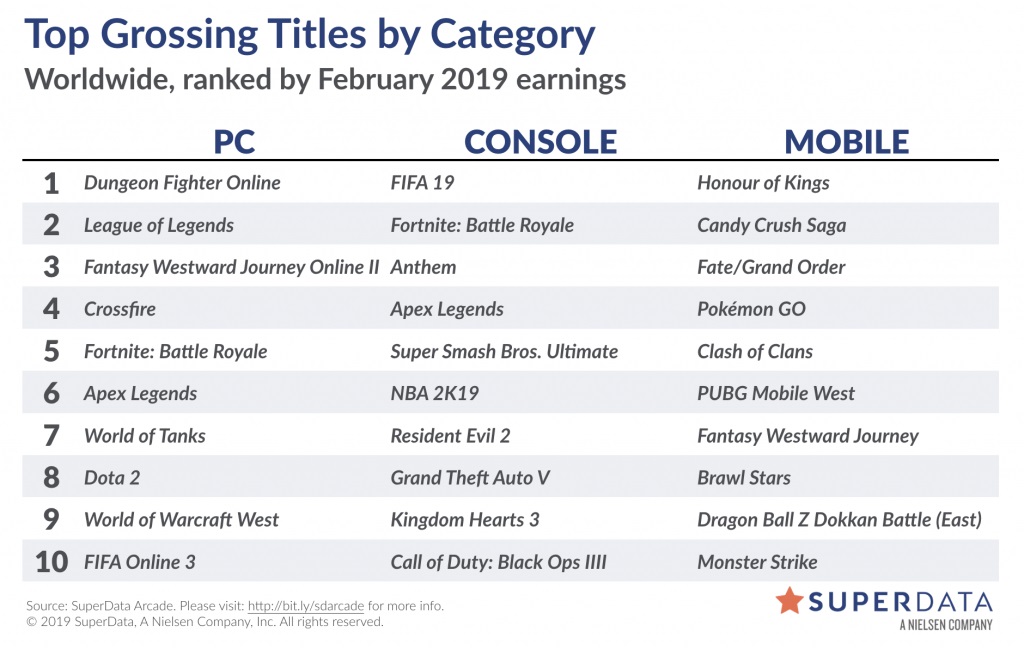 Η SuperData Arcade συλλέγει πληροφορίες για τη βιομηχανία των videogames και κάθε τόσο μας ενημερώνει για το τι έχει συμβεί σε αυτή σε οικονομικό επίπεδο και το Apex Legends δείχνει πως φέρνει ήδη χαμόγελα. Ο τίτλος έχει ήδη έσοδα 92 εκατομμυρίων δολαρίων και μεταμορφώνεται σε αυτόν με το καλύτερο launch στην ιστορία των free-to-play games. Η πλειοψηφία αυτών των εσόδων ήρθε από τις κονσόλες. Από την άλλη το Anthem έχει ήδη σημειώσει 100 εκατομμύρια έσοδα και είναι  ο τίτλος με τις περισσότερες πωλήσεις σε κονσόλες για το Φεβρουάριο. Το Fortnite καλά κρατεί με τα έσοδά του να μην ιδρώνουν και το Hearthstone βλέπει τα έσοδά του να μειώνονται σε σχέση με το προηγούμενο έτος κατά 52% σε PC. Και μετά από όλα αυτά υπάρχει και πινακάκι με τους πιο δημοφιλείς τίτλους για κάθε πλατφόρμα παρακάτω.