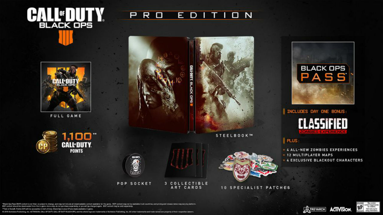 Όσοι αποφασίσουν να αγοράσουν την Call of Duty: Black Ops 4 Pro Edition, θα λάβουν μια φυσική κόπια του παιχνιδιού, το Black Ops Pass, ένα Black Ops 4 steelbook, ένα Black Ops 4 Pop Socket για την τηλεφωνική σας συσκεύ, 10 Specialist Patches, 3 Zombies mode-inspired collectible art cards και 1.100 Call of Duty Points.
