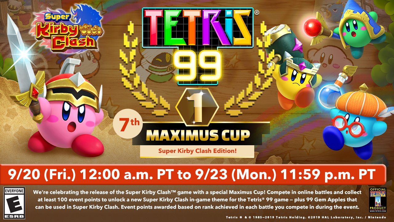 Το Maximus Cup είναι ένα cross-over event, ανάμεσα στο Tetris 99 και το Super Kirby Clash. Οι περισσότεροι προφανώς θυμόσαστε πρόσφατα παρόμοια events στο Tetris 99, με τα Splatoon 2 και Fire Emblem: Three Houses. Αυτή τη φορά οι παίκτες θα έχουν την ευκαιρία να αποκτήσουν το limited-time Super Kirby Clash theme, κερδίζοντας 100 event points.