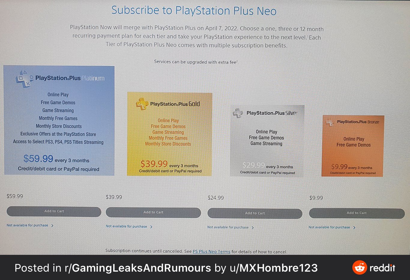 Αρχικό κείμενο: Φήμες των τελευταίων ημερών αναφέρουν ότι η νέα υπηρεσίας της Sony με κωδική ονομασία Spartacus θα αποκαλυφθεί πολύ σύντομα. Μάλιστα, πρόσφατα κυκλοφόρησε στο διαδίκτυο και μία εικόνα που υποτίθεται ότι αφορά τις τιμές των τεσσάρων διαφορετικών πακέτων που θα προσφέρονται. Επιπλέον, η νέα υπηρεσία αναφέρεται ως PlayStation Plus Neo και θα γίνει διαθέσιμη στις 7 Απριλίου 2022, μετά από τη συγχώνευση του PlayStation Plus με το PlayStation Now. Κανείς δεν μπορεί να γνωρίζει αν όντως ισχύουν τα όσα αναφέρονται στην παρακάτω εικόνα. Προβλήματίζει η διαφορά τιμή που παρατηρείται στο παρακάτω πακέτο.