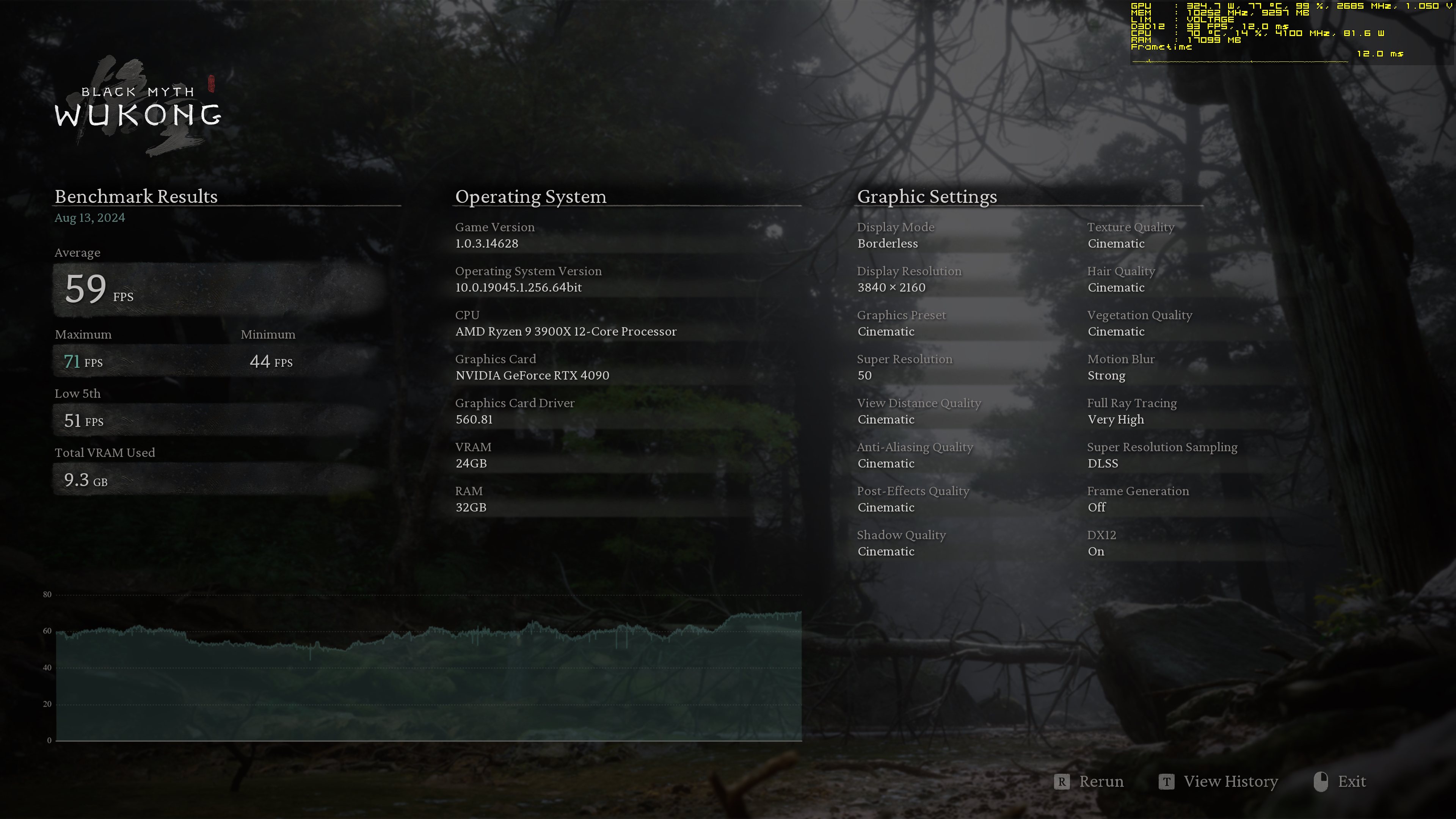 Με ακριβώς τις ίδιες ρυθμίσεις, αλλά βάζοντας το DLSS στο Performance (rendering σε 1080p), πήγαμε αμέσως σε ένα full playable αποτέλεσμα, καθώς τα 59 fps με ελάχιστα 44fps (συνήθως κάποιο stutter, παρόλο που το game κάνει pre-compile την ώρα που το εκκινούμε πρώτη φορά). Σε αυτή τη ρύθμιση και με μια VRR οθόνη, θεωρούμε πως οι κάτοχοι RTX4090 θα το ευχαριστηθούν.