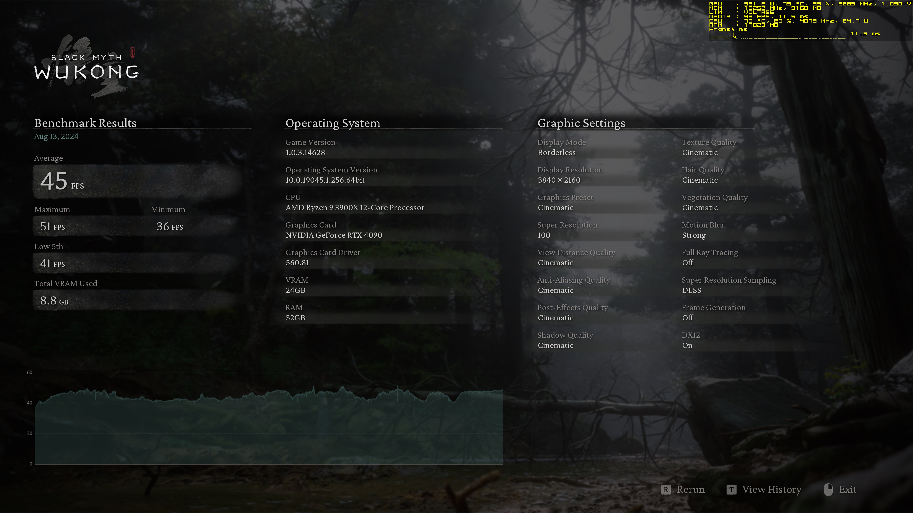 Η συγκεκριμένη τετράδα από benchmark ολοκληρώνεται με τις παραπάνω ρυθμίσεις αλλά βάζοντας το DLSS στο Performance, χωρίς RT και με γραφικά στο Cinematic δηλαδή. Εδώ παίρνουμε και το υψηλότερο frame rate, το οποίο μετρήθηκε στα 78 fps. Δεν είναι βέβαια κάποιο αποτέλεσμα που βγάζει μάτια, αλλά όσοι θέλουν καλά γραφικά και υψηλό frame rate, μάλλον θα καταλήξουν εδώ.