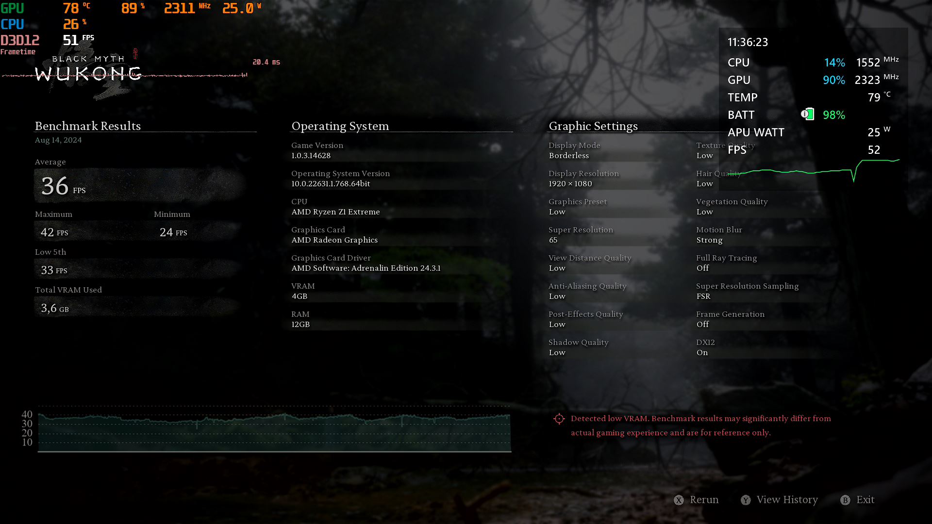 Στο Rog Ally, τα πράγματα είναι καλύτερα, τουλάχιστον με το Turbo προφίλ με την APU στα 25 Watt. Το παιχνίδι ρυθμίστηκε αυτόματα με όλα στο Low, ανάλυση 1080p και FSR στο 66% (περίπου 720p αρχική και μετά upscale σε 1080p), με το frame rate να είνα της τάξης των 36fps. Με ανάλυση 720p και το FSR στο 66%, πήραμε 56fps ενώ σε native 720p (χωρίς FSR) πήραμε 39fps.