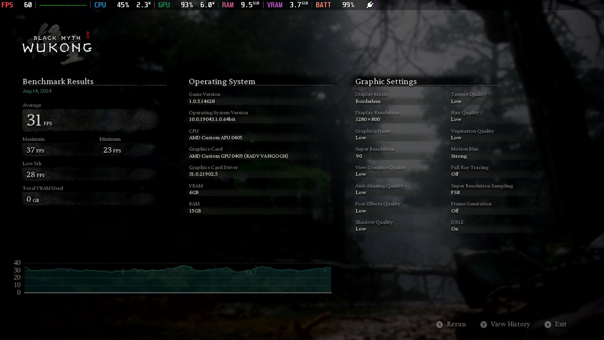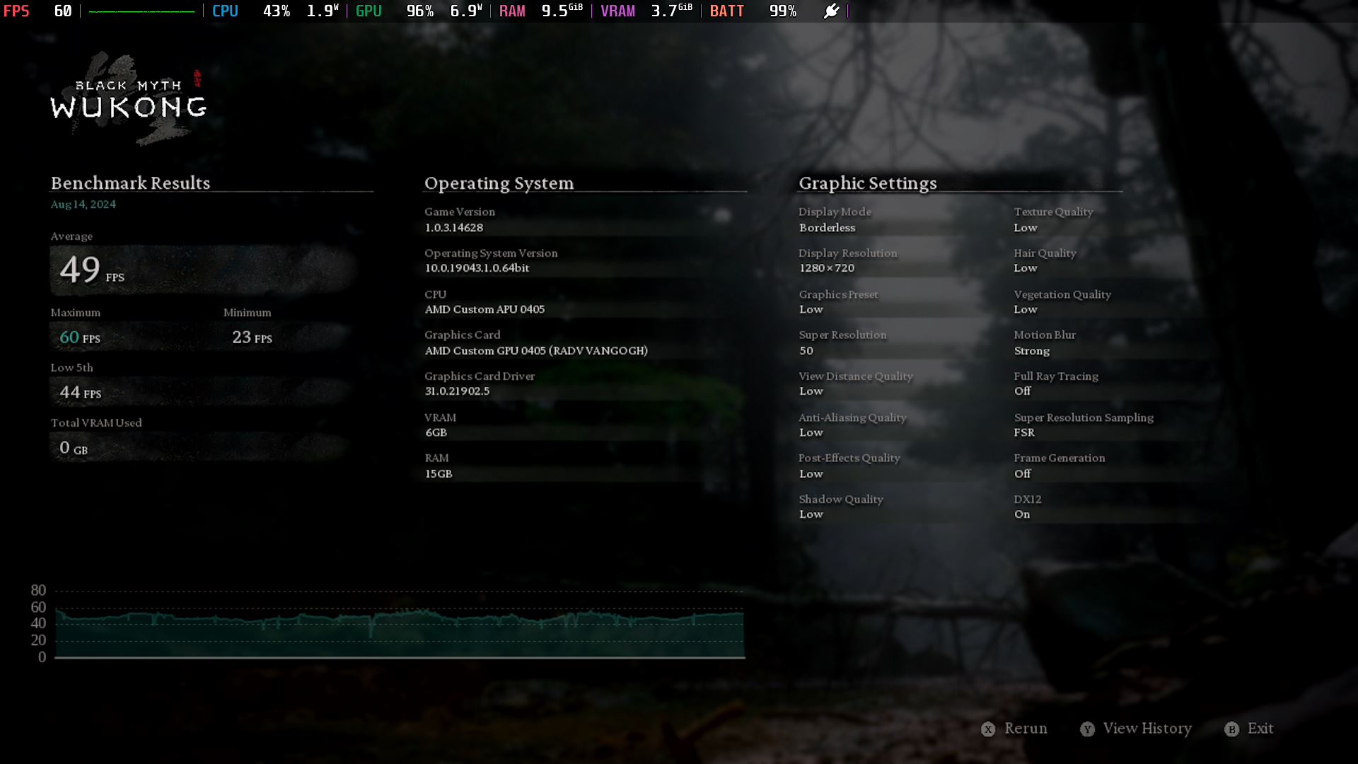 Χωρίς μάχες και εφέ, είναι πολύ πιθανό τα αποτελέσματα που βγάζει να μην είναι απόλυτα αντιπροσωπευτικά, καθώς στο τελικό παιχνίδι θα παίζει ρόλο και η CPU αλλά και τα διάφορα εφέ που θα εμφανίζονται στην οθόνη κατά τη διάρκεια των μαχών. Όπως και να έχεις, εμείς το τρέξαμε σε δυο συστήματα, ένα dekstop PC, το Steam Deck και το ROG Ally. Ξεκινώντας από το Steam Deck, φαίνεται πως δύσκολα κάποιος θα το ευχαριστηθεί. Αν και το benchmark τρέχει, το παιχνίδι ρυθμίζεται αυτόματα με όλες τις ρυθμίσεις στο Low και το FSR στο 90% της native ανάλυσης (720p). Βάζοντας το FSR στο 50%, δηλαδή με αρχική ανάλυση 640x360 (!), πήραμε 49fps, όμως η εικόνα ακόμα και στις 7'' του Steam Deck δεν είναι η καλύτερη δυνατή.