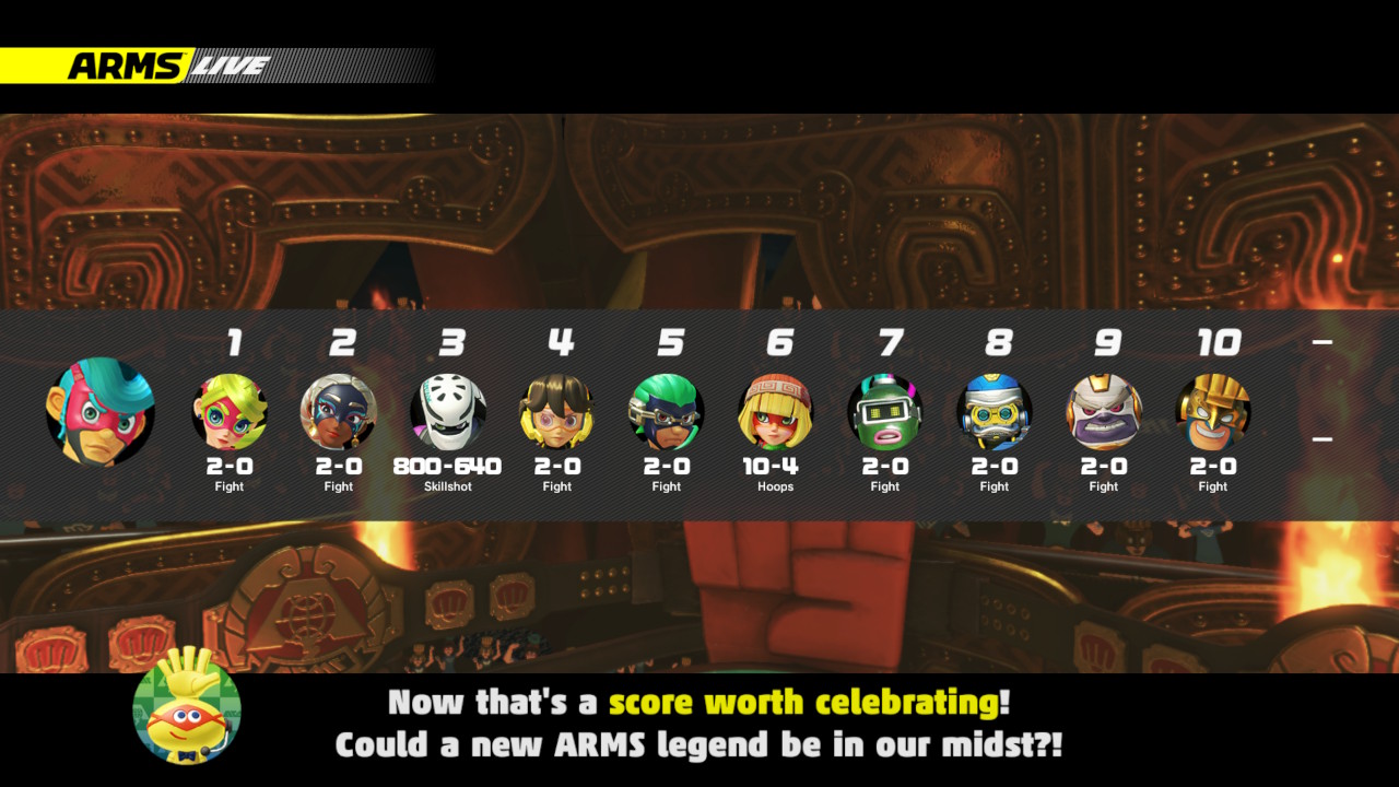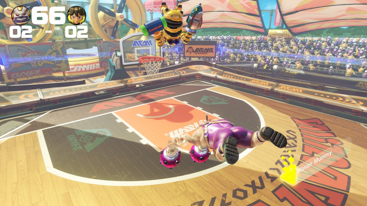 Εξίσου απλή σύλληψη έχει και το Hoops το οποίο διαδραματίζεται σε γήπεδο μπάσκετ. Εδώ οι απλές επιθέσεις δεν έχουν ιδιαίτερο νόημα και ο τελικός σκοπός είναι να…σουτάρετε τον αντίπαλο σας μέσα στο καλάθι της μπασκέτας. Για να το κάνετε αυτό δεν αρκούν οι απλές επιθέσεις αλλά πρέπει να τον πιάσετε με λαβή. Αν βάλετε καλάθι έξω από την γραμμή των 6,75 μέτρων, κερδίζετε 3 πόντους, αλλιώς σημειώνετε δίποντο. Το Skillshot που επίσης μπορούν να παίξουν μέχρι τέσσερα άτομα, τοποθετεί τους αντιπάλους αντικριστά και εμφανίζει ανάμεσα τους στόχους για σύντομο χρονικό διάστημα. Όποιος καταρρίψει τους περισσότερους από αυτούς, κερδίζει και τον αγώνα. Για το τέλος αφήσαμε το 1-on-100 που είναι ο κλασικός αγώνας αντοχής και σας θέτει αντιμέτωπους με 100 εχθρούς. Στο Versus όμως θα βρείτε και το ARMS Test που απλά είναι η τυχαία διαλογή κανόνων/modes και το, χωρίς περαιτέρω επεξηγήσεις, Practice. Οι επόμενες επιλογές στο κεντρικό μενού αφορούν το παιχνίδι πολλών παικτών μέσω διαδικτύου: στο Party Match βρίσκουμε τα online lobbies όπου τρέχουν κάθε γύρο διαφορετικό τρόπο παιχνιδιού, στο Ranked Match υπάρχουν τα ματς κατάταξης που ξεκλειδώνουν μόνο εφόσον ολοκληρώσετε το Grand Prix σε επίπεδο δυσκολίας 4 και άνω, στο Friends βλέπετε αν κάποιος φίλος σας είναι online ώστε να τον προκαλέσετε σε μονομαχία ενώ στο Local μπορείτε να συνδέσετε μεταξύ τους τα Switch που υπάρχουν στον χώρο ώστε να φτιάξετε ένα LAN Party.