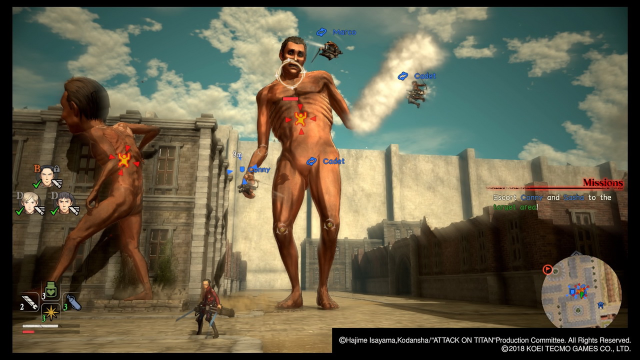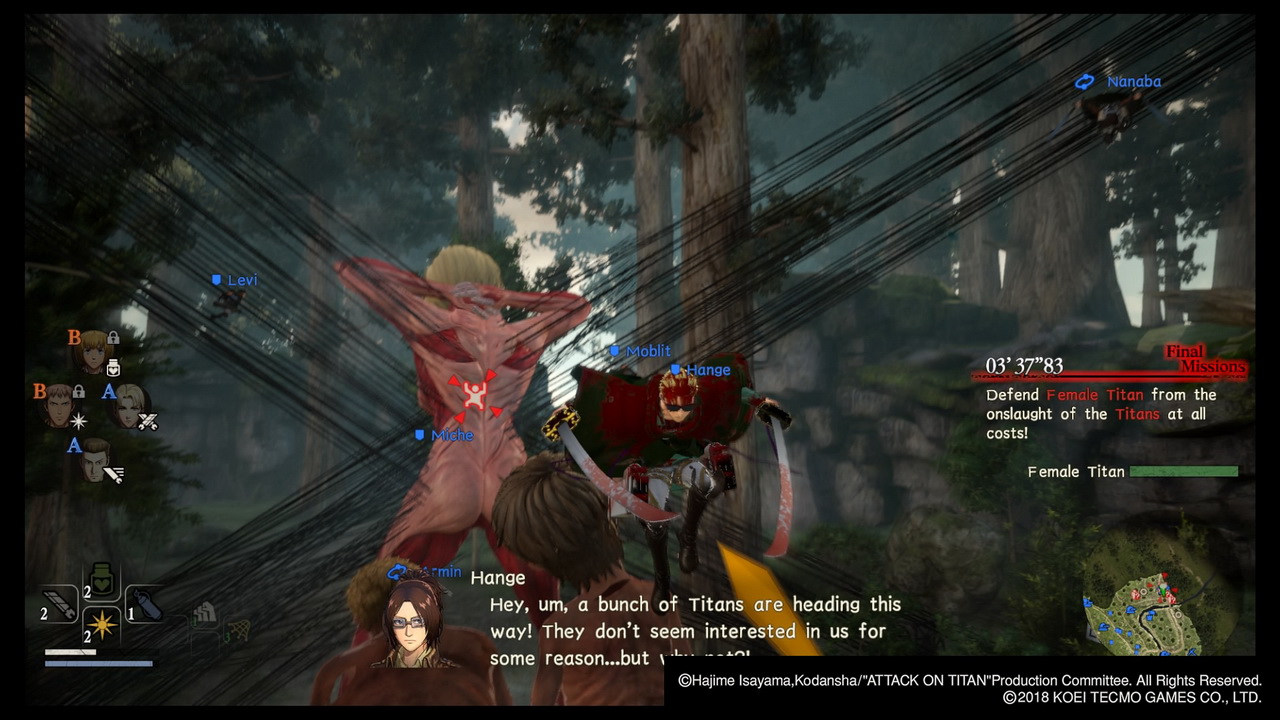 Τα πράγματα σοβαρεύουν όταν δεν υπάρχουν τα χαζά βλέμματα και κάνουν την εμφάνισή τους ψυλλιασμένοι τιτάνες και ειδικότερα όταν έρχεται ολόκληρη παρέα από αυτούς. Ένα πολύ θετικό χαρακτηριστικό είναι η δυνατότητα του παίκτη να κάνει φίλους τους χαρακτήρες της σειράς και στη συνέχεια να τους στρατολογήσει σε quests και μέσω εντολών να πραγματοποιήσει μαζί τους ειδικές επιθέσεις που κάνουν υπολογίσιμη ζημιά στους στόχους τους. Στις μάχες λοιπόν με τιτάνες που φέρονται πιο έξυπνα από τους περισσότερους και υπάρχει η υποτυπώδης αίσθηση co-op (το πραγματικό co-op mode είναι λιγότερο απολαυστικό) το Attack on Titan 2 δείχνει να θριαμβεύει. Επιπλέον υπάρχει ποικιλία όπλων και εξοπλισμού ODM (Omni-Directional Mobility) που κάνει τον παίκτη να αισθάνεται Spider-Man με ενδιαφέρον σύστημα αναβαθμίσεων και δυνατότητα fusion σε -πρακτικά- ό,τι έχει αγοράσει ο παίκτης. Οι σχέσεις με τους υπόλοιπους χαρακτήρες αναπτύσσονται και μέσω side-quests που μεταφράζονται σε «χάρες» που ζητούνται από τον παίκτη ή από συνοδείες VIP κατά τη μετακίνηση από μια περιοχή σε κάποια άλλη.