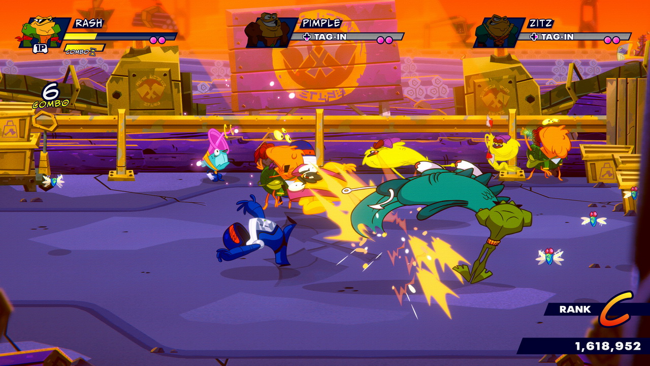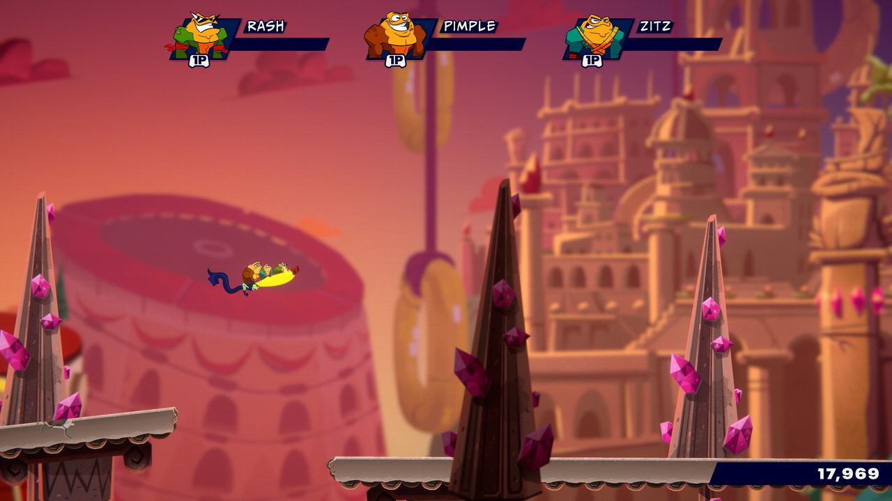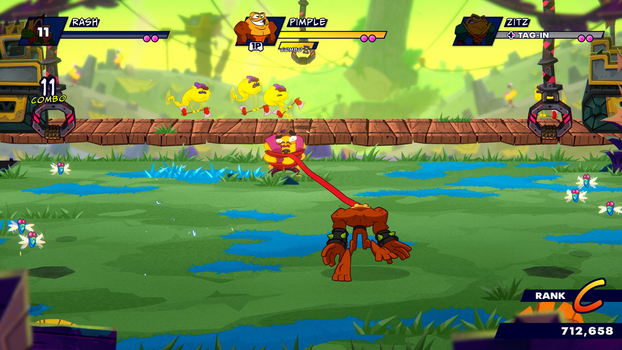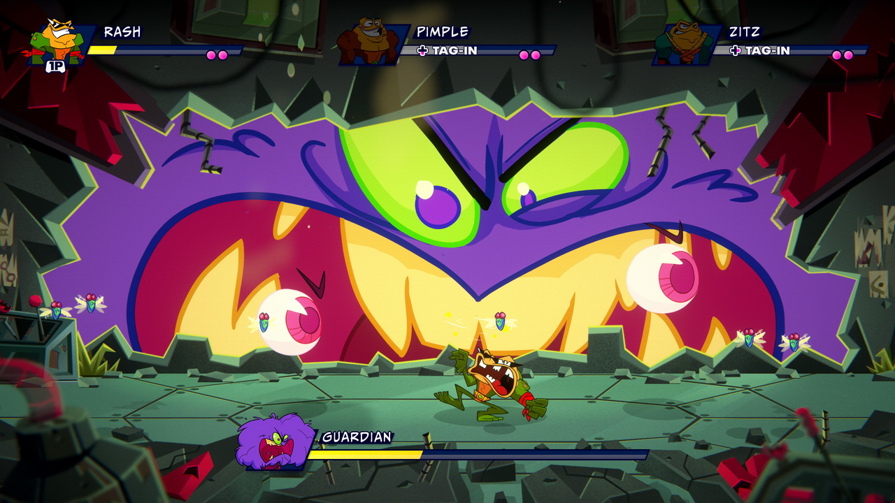 Για παράδειγμα, οι αποστολές είδους beat 'em up έχουν πολύ ενδιαφέρον, από το πώς με ένα πλήκτρο ο παίκτης εναλλάσσει μεταξύ των τριών βατράχων κατά βούληση ως το πόσο μακρόσυρτα combos μπορούν να επιτευχθούν. Σίγουρα, δεν έχει το βάθος του πρόσφατου Streets of Rage 4, όμως προσφέρει αρκετή ποικιλία ώστε κάθε μάχη να είναι διασκεδαστική: light attacks, launchers και heavy attacks συνδυάζονται με τη γλώσσα που φέρνει κοντά εχθρούς ή πηγαίνει τον παίκτη σε αυτούς, και το «κερασάκι» είναι το... φτύσιμο τσίχλας που λειτουργεί ως stun. Κάθε βάτραχος επίσης λειτουργεί διαφορετικά, με τον Pimple να έχει σύντομα και αργά combos αλλά μεγάλο damage, τον Zitz να είναι ταχύτατος αλλά πιο αδύναμος και τον Rash να είναι κάτι μεταξύ των δύο. Υπάρχει αρκετή ποικιλία τόσο σε περιβάλλοντα όσο και σε εχθρούς, ενώ οι αποστολές τέτοιου τύπου δεν ήταν τόσες ώστε να κουράσουν, ούτε βρίσκονταν πάντα σε διαδοχική σειρά. Μακάρι να μπορούσαμε να πούμε τα ίδια για τα levels όπου παίζονται ως twin-stick shooters. Ήταν τρεις αποστολές, κάτι που μπορεί να ακούγεται λίγο, αλλά στην πράξη ήταν πάνω από μισή ώρα του συνολικού χρόνου παιχνιδιού. Λαμβάνοντας υπόψη την κάπως μεγάλη δυσκολία του παιχνιδιού - άλλωστε, είναι ένα από τα χαρακτηριστικά του κλασικού Battletoads- το μισάωρο αυτό περιείχε αρκετό εκνευρισμό ώστε να ξινίσει την, έως τότε, διασκεδαστική εμπειρία.