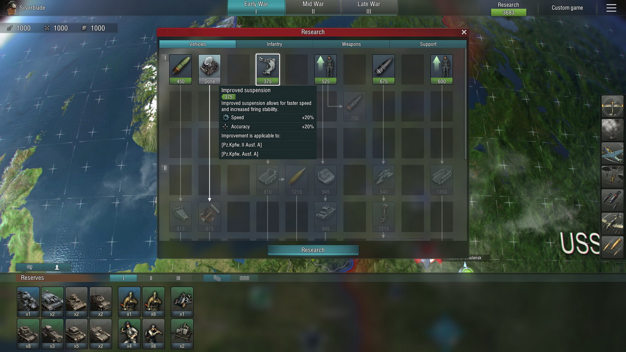 Οι δυνατότητες αυτές, καθώς και οι μονάδες μας, αναβαθμίζονται με research points, τα οποία αποκτώνται μετά από κάθε μάχη, ακόμα και όταν ηττόμαστε (φυσικά οι πόντοι είναι λιγότεροι σε περίπτωση ήττας). Για το λόγο αυτό υπάρχουν τρία αντίστοιχα research trees με το κόστος να αυξάνεται αντίστοιχα όσο προχωράμε προς τις πιο εξελιγμένες επιλογές. Τέλος, πρέπει να αναφέρουμε ότι υπάρχει ένα ακόμα mode παιχνιδιού, το Base Defence. Πρόκειται για ένα τύπο ασύγχρονου multiplayer που αντλεί την έμπνευσή του από κάποια casual strategy καθώς και από tower defence games. Πολύ απλά στήνουμε τη βάση μας με οχυρωματικά έργα και όσες από τις μονάδες μας κρίνουμε απαραίτητο, και χρησιμοποιούμε το υπόλοιπό μας roster για να επιτεθούμε σε βάσεις άλλων παικτών. Η άμυνα γίνεται αυτομάτως και μπορούμε να δούμε το replay ώστε να εντοπίσουμε τα αδύνατά μας σημεία (και να πάρουμε, ίσως, ιδέες για επίθεση).