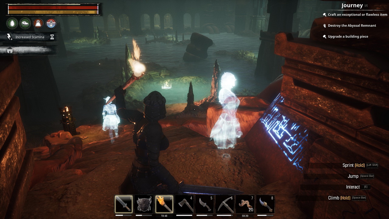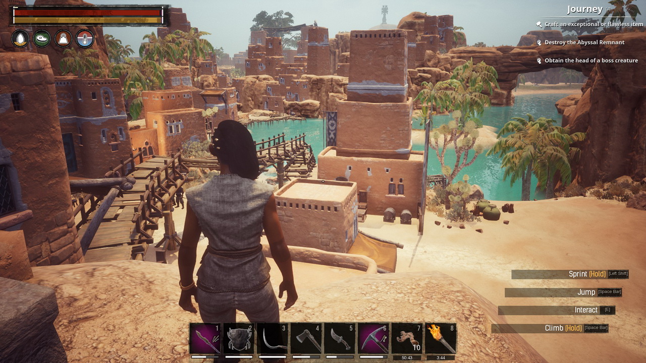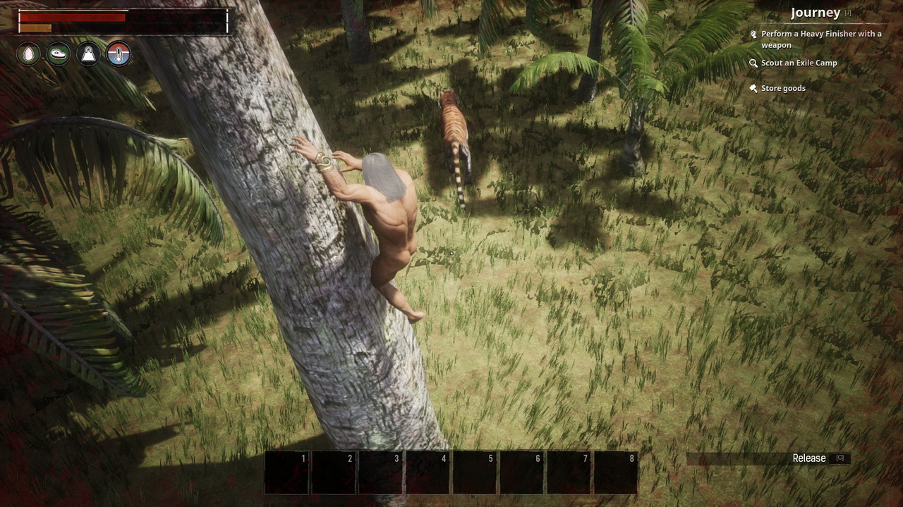 Η δυνατότητα ελεύθερης αναρρίχησης σχεδόν σε κάθε τοίχο, δέντρο και βράχο είναι κάτι που δε βρίσκουμε συχνά σε ένα παιχνίδι. Πόσες φορές θυμάστε να χοροπηδάτε αναξιοπρεπώς σαν κριάρια για να ανεβείτε ένα βουνό στο Skyrim ή στο The Witcher 3 για παράδειγμα; Το Exiles μάς δίνει τη δυνατότητα να σκαρφαλώσουμε σχεδόν παντού, ακόμα και σε επιφάνειες που δε μοιάζει πιθανό να σκαρφαλώνονται με γυμνά χέρια, χρησιμοποιώντας απλά το stamina. Η μπάρα της αντοχής μας δεν ανανεώνεται όσο δεν πατάμε σε κάποιο πλάτωμα ή περβάζι και όταν εξαντληθεί, απλά πέφτουμε στο κενό. Φαίνεται κάτι τόσο απλό και όμως υλοποιείται σπάνια σε τίτλο που δεν λέγεται Assassin's Creed και σχεδόν ποτέ σε τέτοια έκταση. Σε ορισμένες περιπτώσεις, όπως αφού πεθάνει ο χαρακτήρας και αναγκαστούμε να γυρίσουμε γυμνοί πίσω στο πτώμα μας για να ανακτήσουμε τα αντικείμενά μας (αν είμαστε τυχεροί), η δυνατότητα να αποφύγουμε κάποιο άγριο ζώο με αυτόν τον τρόπο είναι τόσο ρεαλιστική όσο και πολύτιμη. Εδώ πρέπει να πούμε ότι είναι κάτι το εξαιρετικά άβολο (όσο και αστείο) να κρέμεται κανείς γυμνός από ένα δέντρο με μια τίγρη να κάνει βόλτες από κάτω.