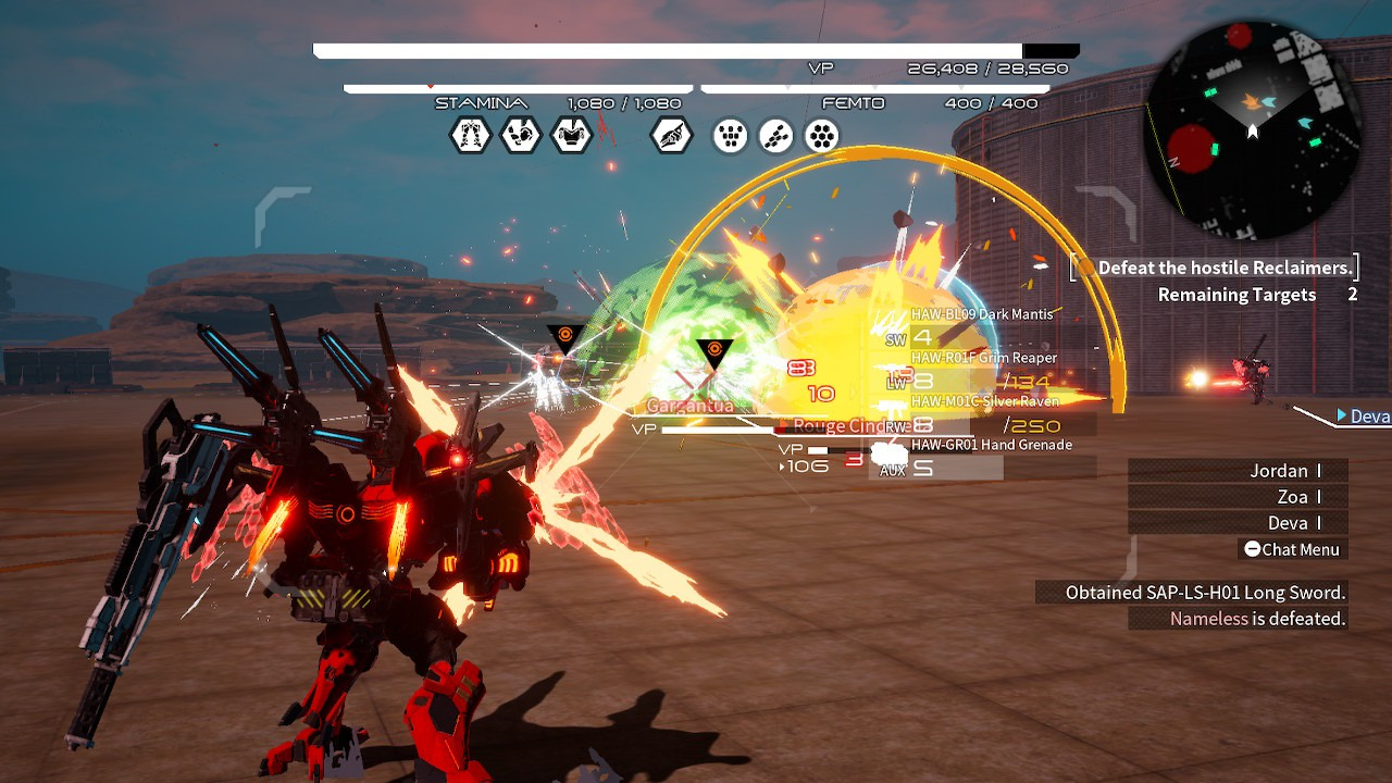 Η ποικιλία σε εξαρτήματα είναι απίθανη βέβαια και, προς τιμήν της Marvelous, δεν αποτελεί ευκαιρία για παράλογες επενδύσεις, ούτε καν στην οικονομία του ίδιου του παιχνιδιού. Συχνά είναι καλά τα εξαρτήματα που βρίσκει κανείς στο κουφάρι ενός αντιπάλου. Κι επειδή δεν μπορεί να πάρει τα πάντα μαζί του, ο παίκτης αναγκάζεται να σκέφτεται και λίγο παραπάνω για το κόστος ευκαιρίας. Η ευκαιρία υφίσταται λοιπόν, η ποικιλία είναι μεγάλη, καλύτερα να μην πούμε όμως σε ποιο κύκλο της κολάσεως ανήκει το UI, το μενού μέσω του οποίου διαχειρίζεται κανείς όλα αυτά. Ακόμη και η σύγκριση εξαρτημάτων είναι μαρτύριο. Το κακό UI σε τέτοιες περιπτώσεις δεν είναι περίεργο σε ιαπωνικές παραγωγές, αυτό βέβαια δεν το κάνει και πιο ευχάριστο στην πράξη. Αυτή η τιμή ανήκει στα co-op missions. Μπορεί να μην είναι σωστά ισορροπημένα για τη συμμετοχή έως και 4 παικτών, αλλά με συνεννόηση εντυπωσιακές μανούβρες τα αποτελέσματα μπορεί να είναι εκπληκτικά. Ευτυχώς αναμένονται κι άλλες τέτοιες αποστολές στο μέλλον, ενώ δεν είναι καν υποχρεωτικό το καρέ πραγματικών παικτών, μπορεί να καληφθεί και με AI το κενό, με την ειρωνεία, δεδομένου του lore, να μην περνά απαρατήρητη. Στα συν υπολογίζουμε και το PvP mode που προστέθηκε εσχάτως, για παρόμοιους λόγους. Άλλη χάρη να υπάρχει παίκτης στην άλλη άκρη. Βέβαια και στα multiplayer modes συναντήσαμε κουφά, όπως πλήρη αδυναμία αλλαγής loadout άπαξ και μπει κάποιος στο mode. Πρέπει να βγει για να αλλάξει το οτιδήποτε ή να δεχθεί ότι θα ψάξει για αποστολές που είναι κομμένες και ραμμένες στο loadout που έχει τη δεδομένη στιγμή.
