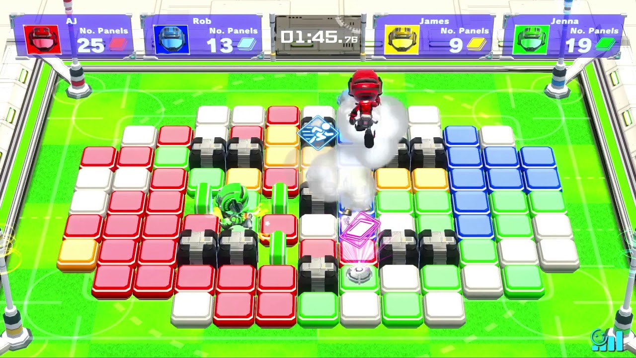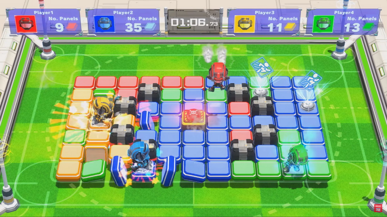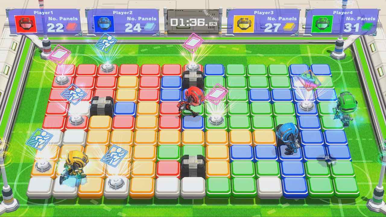 Δεν είναι μόνο οι άλλοι παίκτες στη λίστα με τους κινδύνους, αφού σε κάποια επίπεδα περνούν κύματα κατά διαστήματα που ταράζουν τα πλακίδια και μπορούν να στείλουν τον παίκτη εκτός. Με ένα καλά υπολογισμένο άλμα πάντως, γλιτώνει κανείς. Όχι πως είναι και το πιο εύκολο πράγμα πάνω στο χαμό. Κατά περίπτωση εμφανίζονται και διακόπτες που οδηγούν σε διαφορετικά αποτελέσματα. Ένας μετατρέπει τα γύρω του τετράγωνα στο χρώμα εκείνου που τον ενεργοποίησε, ενώ άλλος ενεργοποιεί turret που στρέφεται αυτόματα λίγο λίγο, η ακτίνα του οποίου κάνει ζημιά σε όποιον αντίπαλο βρεθεί στο διάβα της ενώ ταυτόχρονα μετατρέπει τα πλακίδια στην ευθεία στο χρώμα εκείνου που πάτησε το διακόπτη. Δεν είναι για χόρταση οι βοήθειες αυτές βέβαια, αφού υπάρχει και cooldown στη μέση. Μη φανταστείτε ότι είναι πολύ μεγάλο βέβαια, διότι οι αναμετρήσεις διαρκούν μερικά λεπτά συνήθως. Εξαρτάται κι από την αναμέτρηση βέβαια. Στα τρία διαθέσιμα modes κερδίζει όποιος έχει τα περισσότερα τετράγωνα στο χρώμα του στο τέλος του χρόνου, όποιος μείνει όρθιος στο τέλος ή, στο τελευταίο, όποιος καταφέρει τα περισσότερα KO στο διαθέσιμο χρόνο. Δεν πρόκειται να κατηγορηθεί η ομάδα ανάπτυξης ότι δεν αφιέρωσε κόπο και σκέψη στους μηχανισμούς του παιχνιδιού. Ταιριάζει δε η όλη ιδέα στο Switch, αφού κάθε κονσόλα είναι έτοιμη να υποδεχθεί μονομιάς δεύτερο παίκτη. Και όλα είναι διαθέσιμα και online, με quick matches ή δημιουργία room με μικρές παραλλαγές στις ρυθμίσεις της αναμέτρησης.