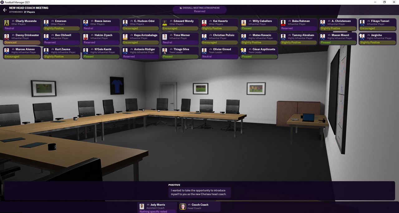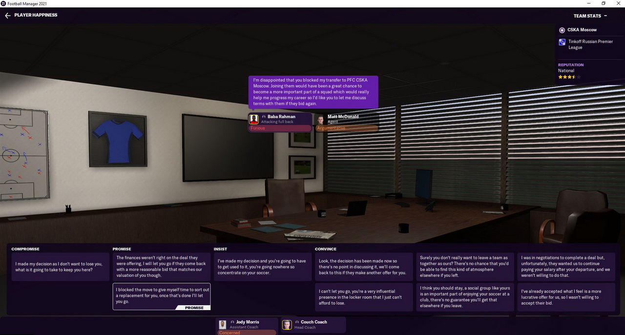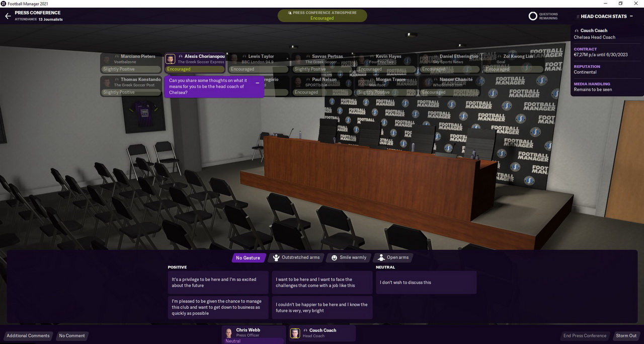 Το Football Manager καταφέρνει μάλιστα να το πράξει με τέτοιο τρόπο ώστε να είναι σημείο αναφοράς στην κατηγορία του και να φτάνει στα όρια της εξελιγμένης εξομοίωσης, ξεπερνώντας τα όρια του gaming. Στόχος της SI Games για το Football Manager 2021 ήταν να στρέψει τα φώτα στον προπονητή και κατ’ επέκταση στον ίδιο τον παίκτη. Προσπάθησε με αισθητικά κυρίως στοιχεία να ισχυροποιήσει το «immersion», την αίσθηση δηλαδή ότι ο παίκτης ζει κυριολεκτικά τα γεγονότα που διαδραματίζονται στην εναλλακτική πραγματικότητα που προβάλλει ο τίτλος στην οθόνη του. Για να το πετύχει, άλλαξε κάθε μορφή αλληλεπίδρασης του προπονητή με τους παίκτες και με εξωτερικούς παράγοντες όπως είναι οι δημοσιογράφοι. Ενώ στις μέχρι τώρα εκδόσεις, όταν ο προπονητής-παίκτης μιλούσε σε κάποιον όριζε τον τόνο της φωνής του, τώρα πλέον η ομιλία του συνοδεύεται από τη γλώσσα του σώματος. Για παράδειγμα, αν ο προπονητής-παίκτης θέλει να επιβραβεύσει έναν αθλητή για την καλή του απόδοση στον αγώνα μπορεί να τον αγκαλιάσει μιλώντας του. Από την άλλη, αν θέλει στο ημίχρονο να εκδηλώσει τα νεύρα του για την αδιαφορία των παικτών του, έχει τη δυνατότητα ακόμα και να πετάξει ένα μπουκάλι νερό προς το μέρος τους! Το ίδιο ισχύει και για τις συνεντεύξεις τύπου. Μπορεί με τις ανάλογες κινήσεις να προσπαθήσει να πείσει τους δημοσιογράφους για την ορθότητα των αποφάσεων του ή να αποφύγει απαντήσεις με επιθετικές χειρονομίες. Όλα αυτά, βέβαια, έχουν αντίκτυπο και προκαλούν αντίστοιχες αντιδράσεις από την πλευρά των παικτών και των δημοσιογράφων, σε συνάρτηση με τον χαρακτήρα του καθενός. Είναι κι αυτό ένα παιχνίδι ισορροπίας που πρέπει να χρησιμοποιείται με σύνεση και μέτρο.