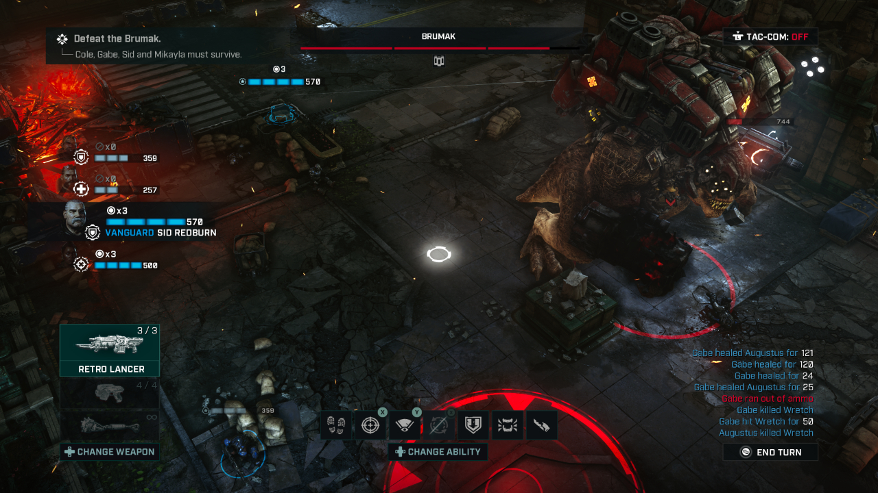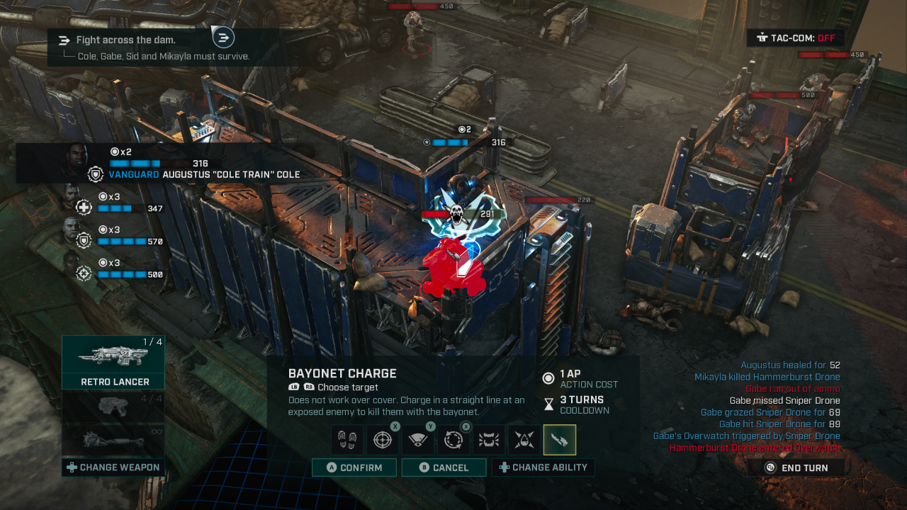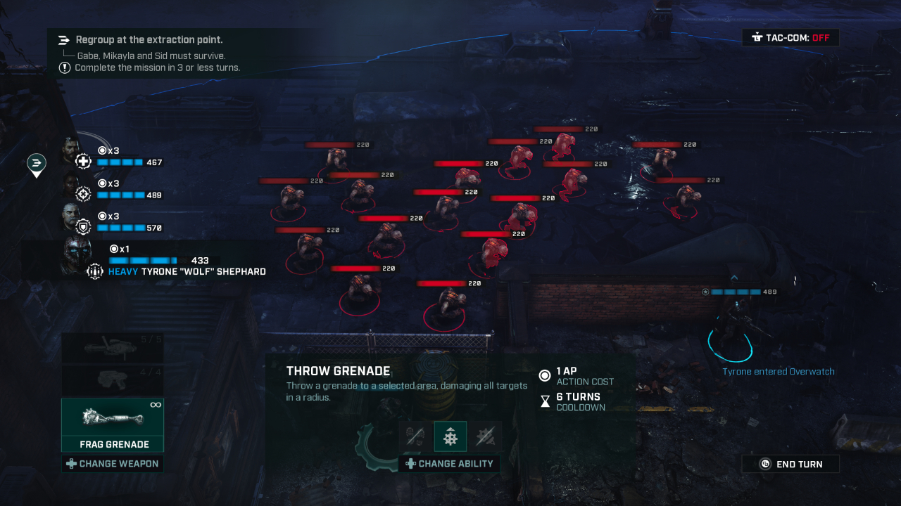 Από την άλλη, το AI των εχθρών κάνει την πρόκληση ακόμη μεγαλύτερη. Αν στρατιώτης του παίκτη έχει στήσει... καρτέρι, τότε οι πιο αδύναμοι ή κοντοί εχθροί δεν θα μπουν στη ζώνη ελέγχου του. Τα Wretches, για παράδειγμα, εκμεταλλεύονται τα χαμηλά εμπόδια για να κινούνται στον χώρο προσπερνώντας τις ζώνες που φυλάει ένας στρατιώτης ώστε ύπουλα να επιτεθούν από άλλη γωνία και να κατακλύσουν τον χαρακτήρα. Αν είναι σε απόσταση αναπνοής, δε, τότε η οποιαδήποτε κίνηση περιλαμβάνει αλλαγή θέσης θα καταλήξει σε μια «δώρο» επίθεση από τα Wretches (κι όχι μόνο, αλλά κάθε εχθρό), τιμωρώντας ακόμη πιο σκληρά τις κακές επιλογές του παίκτη. Σε τέτοιες φάσεις, είναι προτιμότερο να ρίξει μια χειροβομβίδα στα πόδια του και να τους πάρει όλους μαζί, με την ελπίδα ότι κάποιος άλλος σύμμαχος θα τον αναστήσει εγκαίρως, παρά να επιχειρήσει ηρωισμούς που ούτε θα καταλήξουν κάπου καλά, ούτε θα τον βγάλουν από τη δύσκολη θέση. Συνδυάζοντας τα παραπάνω μαζί με τα skills, η εικόνα του πώς εξελίσσεται μια αποστολή έχει αποκτήσει μορφή και κάποιος παίκτης Gears of War σίγουρα θα έχει ήδη εντοπίσει κάποια κοινά στοιχεία. Σε αυτά έρχονται να προστεθούν περισσότερες λεπτομέρειες, όπως η δυνατότητα να «φυτευτεί» ένα grenade σε τοίχο ή πάτωμα, το γεγονός πως ο χαρακτήρας κερδίζει βήματα αν στο τέλος της κίνησής του επιλέξει να καλυφθεί ή κάτι πιο εύκολα αναγνωρίσιμο – τα executions. Με κάποια πιο αδύναμα όπλα, ο εχθρός ενδέχεται να μην πεθάνει όταν η ζωή του αγγίξει το μηδέν κι αντ' αυτού να μείνει σε κατάσταση “DBNO (down but not out) όπου για μερικούς γύρους κάποιος σύμμαχός του μπορεί να τον αναστήσει με μειωμένη ζωή – το ίδιο ισχύει και για τους στρατιώτες του παίκτη. Σε αυτή την κατάσταση λοιπόν, ένας στρατιώτης του παίκτη μπορεί να επιχειρήσει να αποτελειώσει τον εχθρό με ιδιαίτερα αιματηρό τρόπο κι έτσι παράλληλα με τον οριστικό θάνατο ενός εχθρού να κερδίσει κι έναν bonus πόντο ενέργειας για όλους. Είναι μια κίνηση με μεγάλο ρίσκο, βέβαια, καθώς αν γίνει στο τέλος ενός γύρου ενδέχεται να αφήσει εκτεθειμένο τον στρατιώτη.