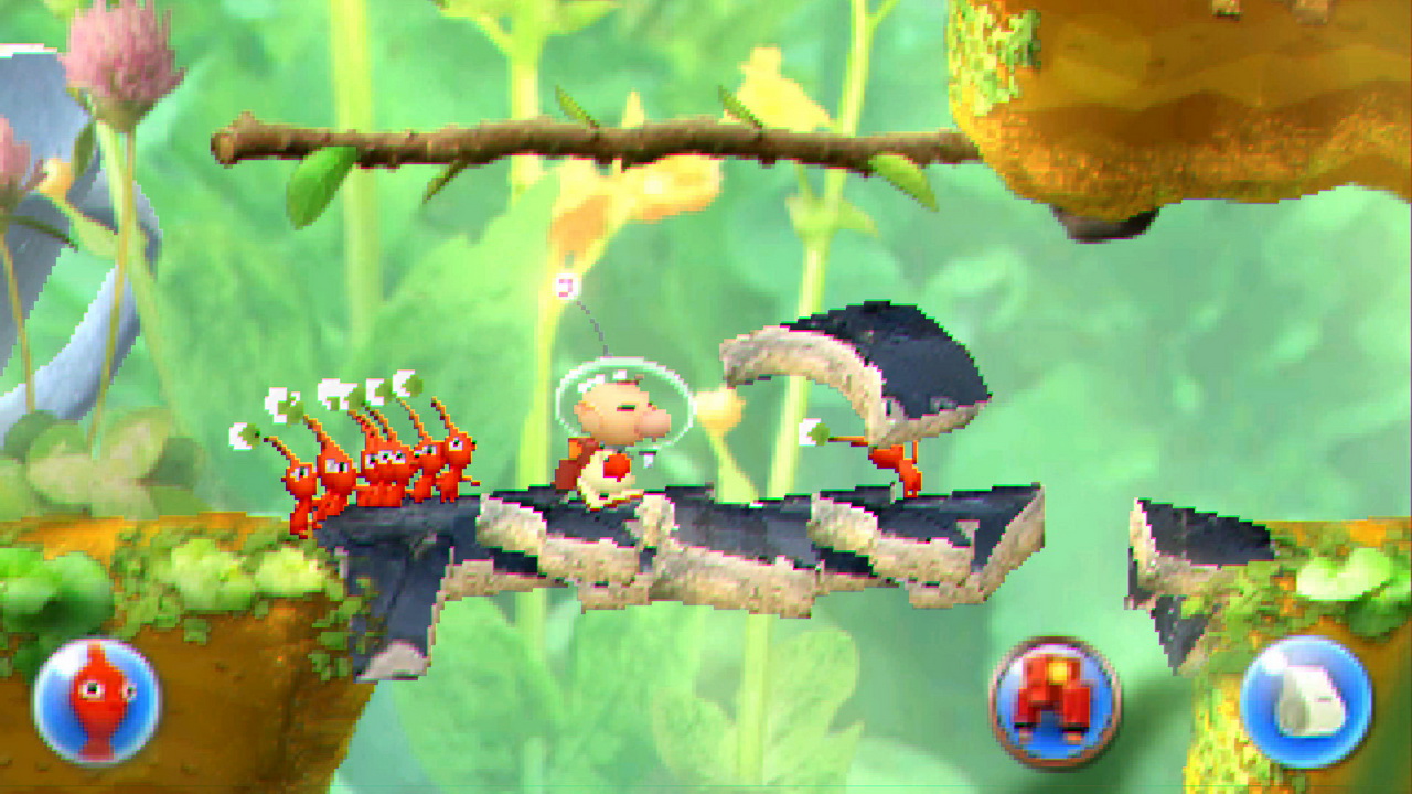 Για καλή του τύχη, ο πλανήτης στον οποίο ναυάγησε είναι γεμάτος Pikmin που στο άκουσμα της σφυρίχτρας του σπεύδουν για βοήθεια. Προσοχή όμως, δεν έχουν όλα τα Pikmin τις ίδιες ικανότητες. Τα κόκκινα έχουν εμπρηστικές τάσεις και δεν καίγονται ακόμα και αν πέσουν μέσα στη φωτιά, τα κίτρινα μπορούν να εκτοξεύονται πιο ψηλά και δεν τα πειράζει ο ηλεκτρισμός, τα μπλε είναι δεινοί κολυμβητές, τα γκρι, λόγω του βάρους τους, μπορούνε να σπάνε βαριά αντικείμενα όπως μεγάλα κομμάτια πάγου και, τέλος, τα ροζ έχουν τη δυνατότητα να πετάνε, φτάνοντας σε μεγάλα ύψη. Συνδυάζοντας τις παραπάνω δυνατότητες, ο Olimar επιχειρεί να συγκεντρώσει τα 30.000 Sparklium που χρειάζεται για να μπορέσει να φτιάξει το σκάφος του και να επιστρέψει στη μαμά πατρίδα. Το πρώτο μήνυμα που θα λάβουν οι παίκτες, πριν καλά καλά ξεκινήσουν να ασχολούνται με το νέο 2.5D platformer, έχει να κάνει με το χειρισμό.