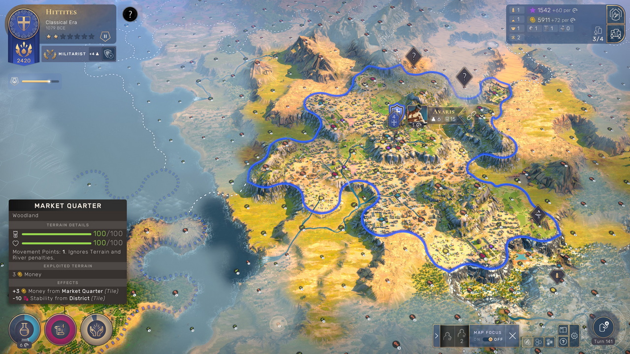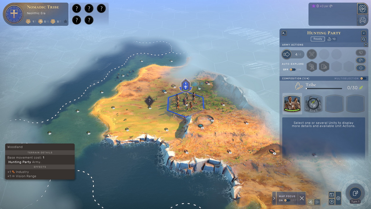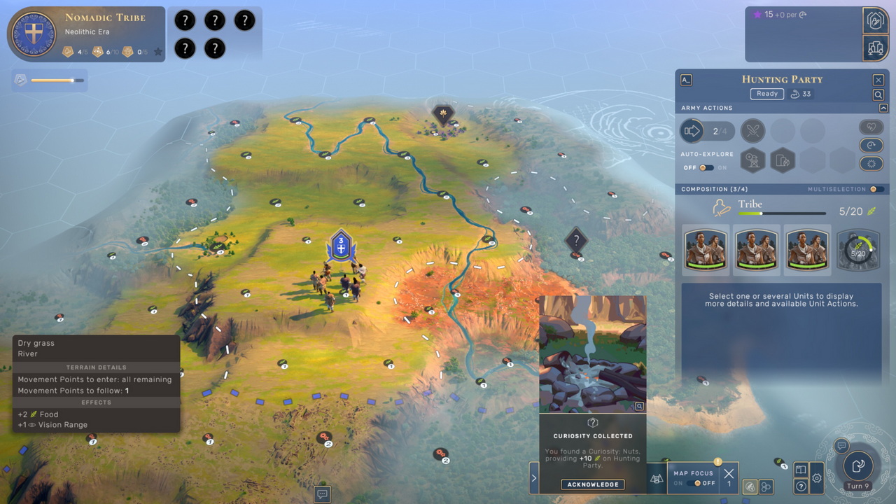 Το Humankind ξεκινά από τη Λίθινη Εποχή, προτού καλά-καλά οι άνθρωποι να έχουν διαμορφώσει τους πρώτους μόνιμους οικισμούς τους. Αντί λοιπόν να ξεκινά με έναν settler σε αναζήτηση του ιδανικού σημείου για την πρώτη πόλη, ο παίκτης ελέγχει μια φυλή κυνηγών-τροφοσυλλεκτών, η οποία εξερευνά το περιβάλλον της, με σκοπό να συλλέξει τροφή για να μεγαλώσει και influence ώστε να μπορέσει να στεριώσει. Με το που γίνει αυτό, το παιχνίδι περνά στο επόμενο στάδιο. Βλέπετε, στο Humankind ο τρόπος για να εξαπλωθεί ένας πολιτισμός περνά από το μηχανισμό του Influence, της πολιτιστικής ισχύος του, να το πούμε χοντρικά. Ενώ το αντίστοιχο culture στη σειρά Civilization επηρεάζει κυρίως την εξάπλωση των συνόρων μας, τα civics και την επιρροή που εξασκεί ο πολιτισμός μας στους άλλους, στο Humankind καθορίζει επιπλέον τον σχηματισμό νέων outposts και το πότε αυτά μπορούν να μετατραπούν σε αυτόνομες πόλεις.