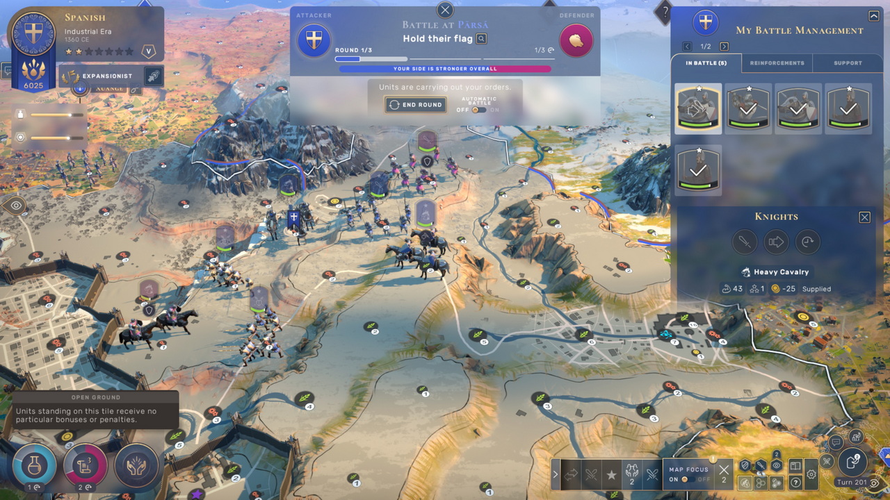 Ο άλλος τομέας είναι η ρύπανση του περιβάλλοντος και η κλιματική αλλαγή. Το Humankind αναφέρεται στο τεράστιο αυτό πρόβλημα και δεν το αγνοεί όπως έκαναν τα τελευταία Civilization (ως το πιο πρόσφατο DLC), ωστόσο οι επιπτώσεις του είναι σχεδόν αμελητέες στις περισσότερες περιπτώσεις. Έχει ενδιαφέρον, πάντως, το γεγονός ότι ένας από τους τρόπους να τελειώσει το παιχνίδι είναι να γίνει ο πλανήτης εντελώς ακατάλληλος για την επιβίωση του είδους, πράγμα που δεν είναι ξεκάθαρο πώς μπορεί να γίνει (ενδεχομένως με την εκτεταμένη χρήση πυρηνικών όπλων). Φυσικά προτού (και αν) φτάσουμε στο σημείο αυτό, είναι σχεδόν σίγουρο ότι θα προηγηθούν αρκετές ένοπλες συγκρούσεις με συμβατικά μέσα, ειδικά αν ο πολιτισμός της επιλογής μας είναι Expansionist ή Militarist. Εκεί έχει την ευκαιρία να λάμψει το σύστημα μάχης, το οποίο είναι πολύ καλύτερο από ό,τι έχει κάνει μέχρι στιγμής το Civilization, χωρίς να λείπουν κάποιες αδυναμίες. Το παιχνίδι κάνει ζουμ στην περιοχή που γίνεται η μάχη, χωρίς να αλλάζει ο χάρτης και τα χαρακτηριστικά του τερέν αντιστοιχούν σε γενικές γραμμές με τα εξάγωνα της εκάστοτε τοποθεσίας. Η μάχη διεξάγεται σε σειρές, ενώ αν τραβήξει περισσότερο θα χρειαστεί να περάσει και κανονική σειρά παιχνιδιού για να συνεχίσει. Το σύστημα μάχης λαμβάνει υπόψη τα χαρακτηριστικά του περιβάλλοντος, όπως το υψόμετρο (the high ground wins), τα τείχη και το line of sight των μονάδων (το οποίο δεν λειτουργεί πάντα όπως θα περιμέναμε). Σε γενικές γραμμές και παρά τις ατέλειες οι μάχες στο Humankind δεν απογοητεύουν.