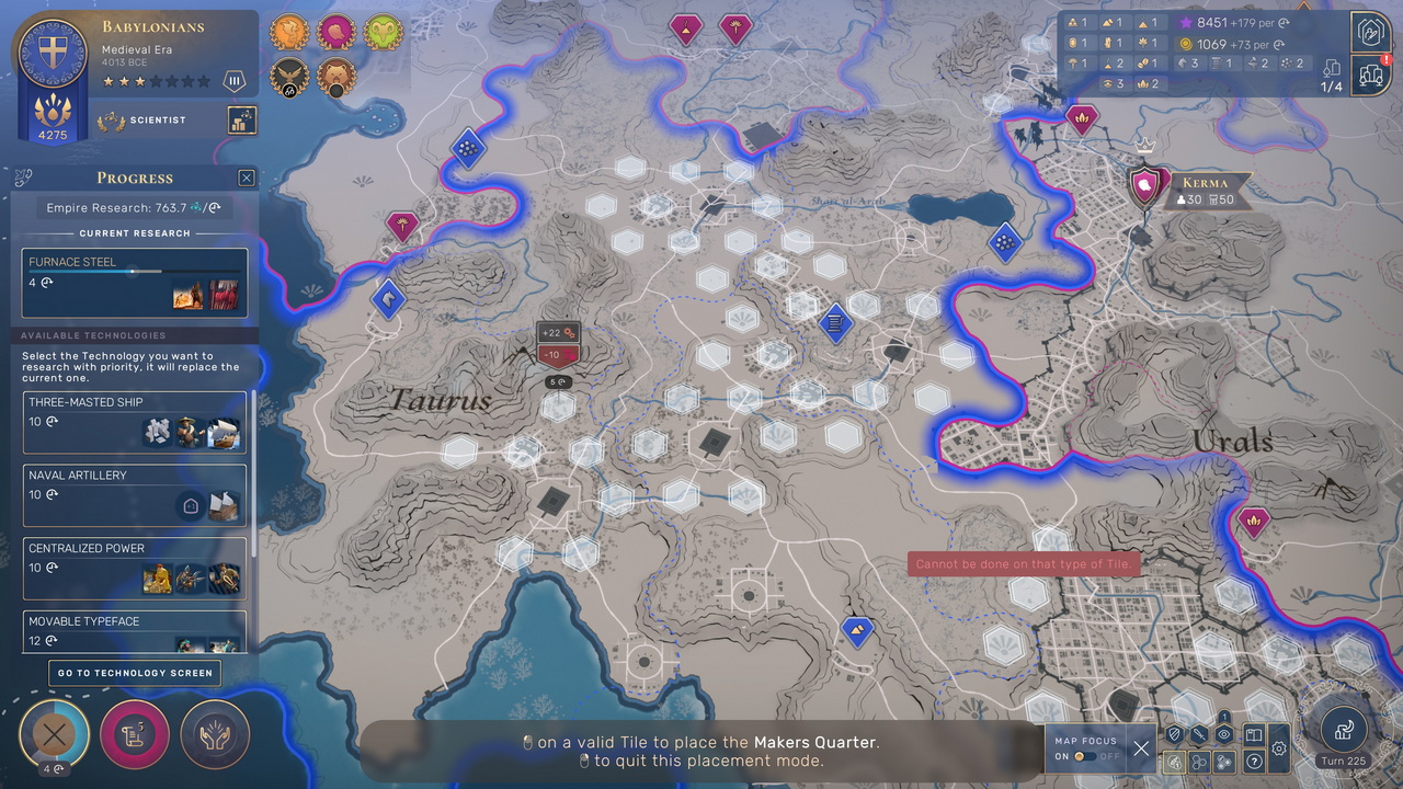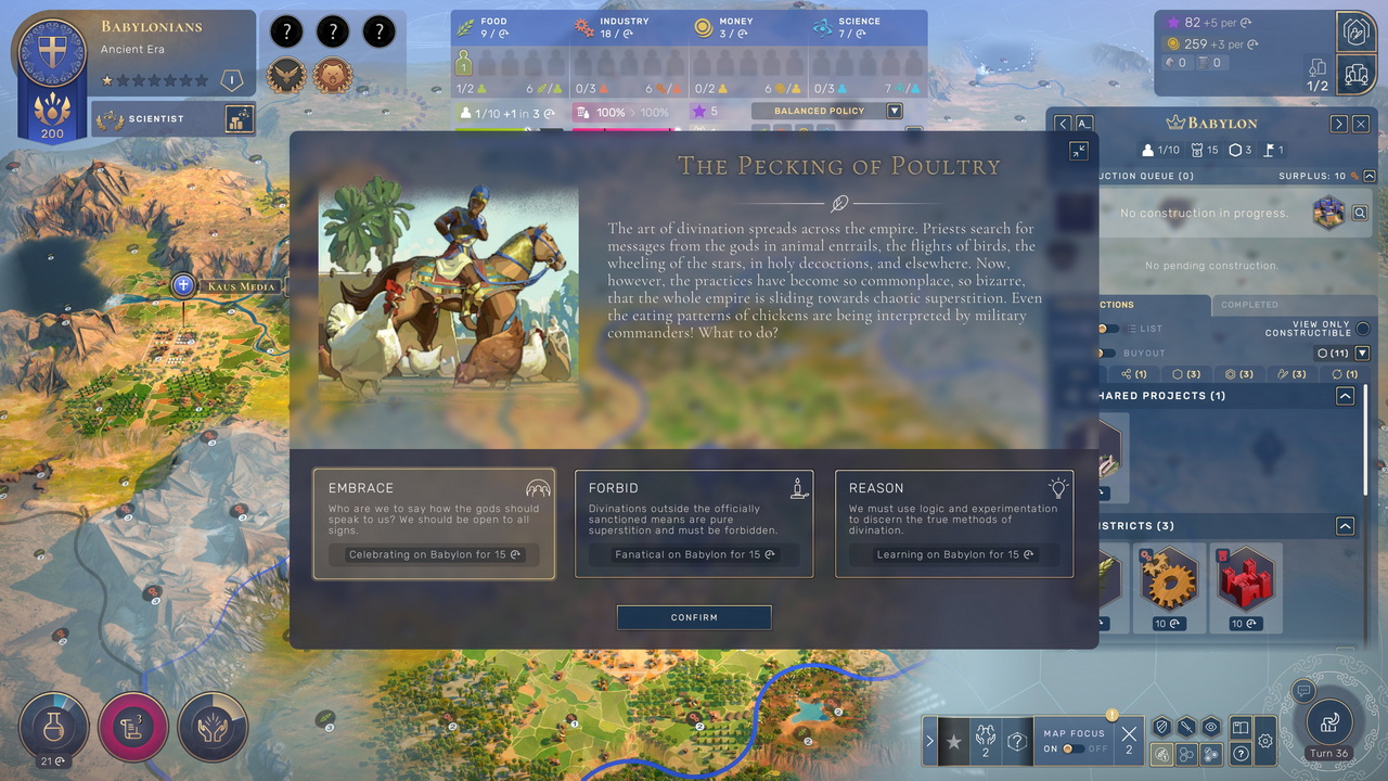 Ίσως η πιο σημαντική διαφοροποίηση του Humankind, ωστόσο, και αυτή που φαίνεται να έχει περάσει απαρατήρητη στα περισσότερα reviews είναι ο περιορισμός του αριθμού των πόλεων. Αυτό καθιστά την αχίλλειο πτέρνα του Civilization, που είναι το ογκώδες και κουραστικό endgame με το micromanagement που απαιτούν δεκάδες πόλεις και μονάδες, πολύ πιο διαχειρίσιμη. To Humankind προσπαθεί τόσο να αποφύγει αυτό το «βάλτωμα» του endgame, ώστε είναι δύσκολο να φτάσουμε στις προηγμένες τεχνολογίες της Σύγχρονης Εποχής προτού λήξει το παιχνίδι, τουλάχιστον στο Normal speed. Το όριο των πόλεων μπορεί να ξεπεραστεί, φυσικά, αλλά το κόστος σε influence είναι τέτοιο, ώστε θα είναι δύσκολο για τον παίκτη να έχει πάνω από 1-3 επιπλέον πόλεις χωρίς η έλλειψη influence να παγώσει την πρόοδό του. Για να λυθεί το πρόβλημα αυτό μπορεί κανείς να προσαρτά outposts στην πόλη του, δημιουργώντας τεράστιες μητροπόλεις που μπορεί να καταλαμβάνουν ολόκληρες ηπείρους ή ακόμα και να συνενώνει πόλεις μεταξύ τους. Κι αν κερδίσει κάποιον πόλεμο, μπορεί να προτιμήσει να δώσει πίσω κατακτημένες πόλεις με αντάλλαγμα λεφτά ή ακόμα και όρκο υποτελείας.