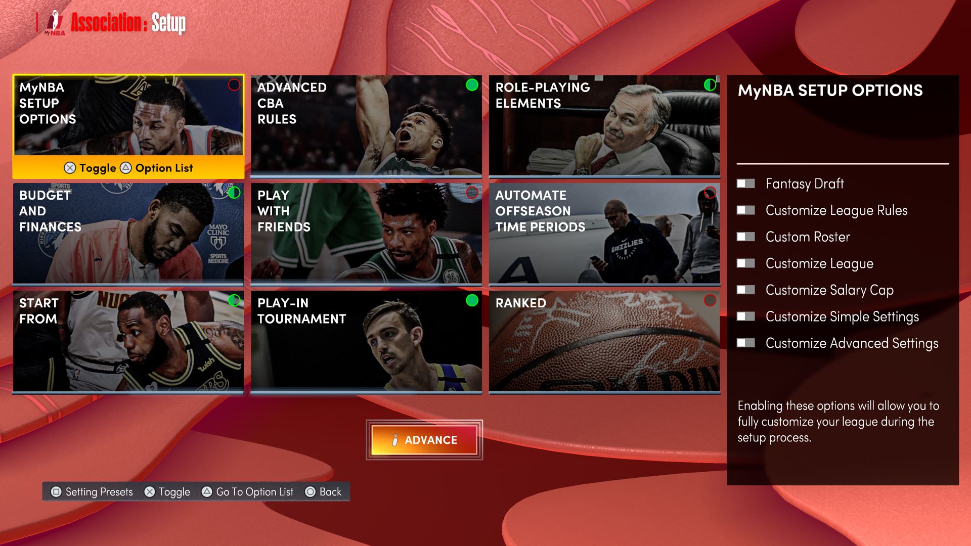 Η επιλογή Play Now, προσφέρει τα βασικά, όπως το Quick Play για γρήγορο παιχνίδι, το NBA Today που μας δίνει τη δυνατότητα να παίξουμε παιχνίδια που γίνονται εκείνη την ημέρα (εφόσον έχει ξεκινήσει το NBA), τη δυνατότητα για online matches (το online φαίνεται φέτος να λειτουργεί καλά), το σύστημα εκπαίδευσης 2KU και το Blacktop. Στη πραγματικότητα, είναι ακριβώς τα ίδια με την περυσινή έκδοση. Το MyNBA δίνει τη δυνατότητα στο παίχτη, μέσα από πολλές διαφορετικές επιλογές, να φτιάξει το δικό του πρωτάθλημα. Η αλήθεια είναι πως αυτή η επιλογή είναι ενδιαφέρουσα για τους λάτρεις του μπάσκετ που δε θέλουν να ασχοληθούν με το in-game (και κανονικό) χρήμα που απαιτείται στα MyCareer και MyTeam καθώς δίνει στο gamer τα εργαλεία για να δημιουργήσει αυτό που θέλει, όπως το θέλει. Οι επιλογές είναι πραγματικά πολλές, δίνοντας στο παίχτη τη δυνατότητα για εις βάθος παραμετροποίηση του πρωταθλήματος, από τις ίδιες τις ομάδες, τη διαχείριση salary cup και σχέσεων παιχτών, τη χρήση General Manager και φυσικά το αν το πρωτάθλημα θα είναι off line ή online. Το mode αυτό είναι για όσους θέλουν να απολαύσουν το άθλημα. Δυο επιλογές ακόμα που υπάρχουν είναι τα 2K Share Setups και 2K Share Scenarios. Εδώ μπορεί κανείς από τη μια να δημιουργήσει τα δικά του setup πρωταθλημάτων και από την ειδικά σενάρια που μπορεί να παίξει και να τα μοιράσει στη κοινότητα.