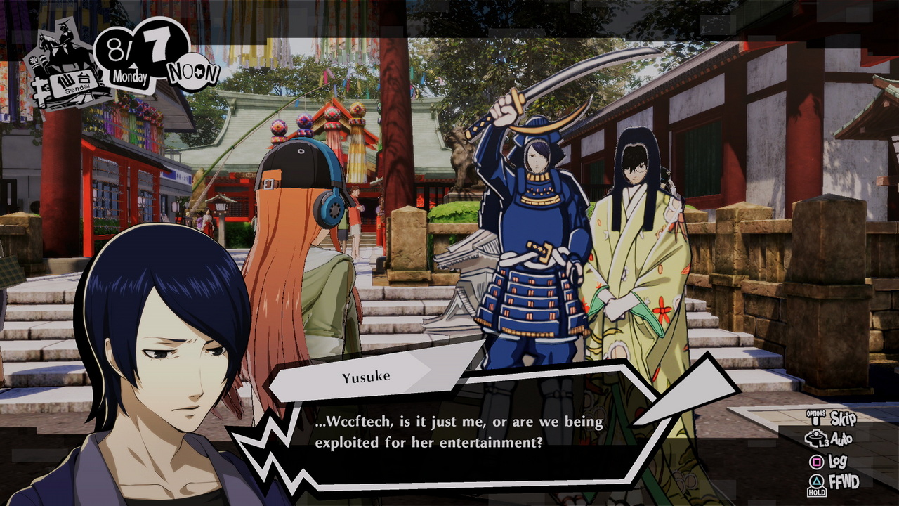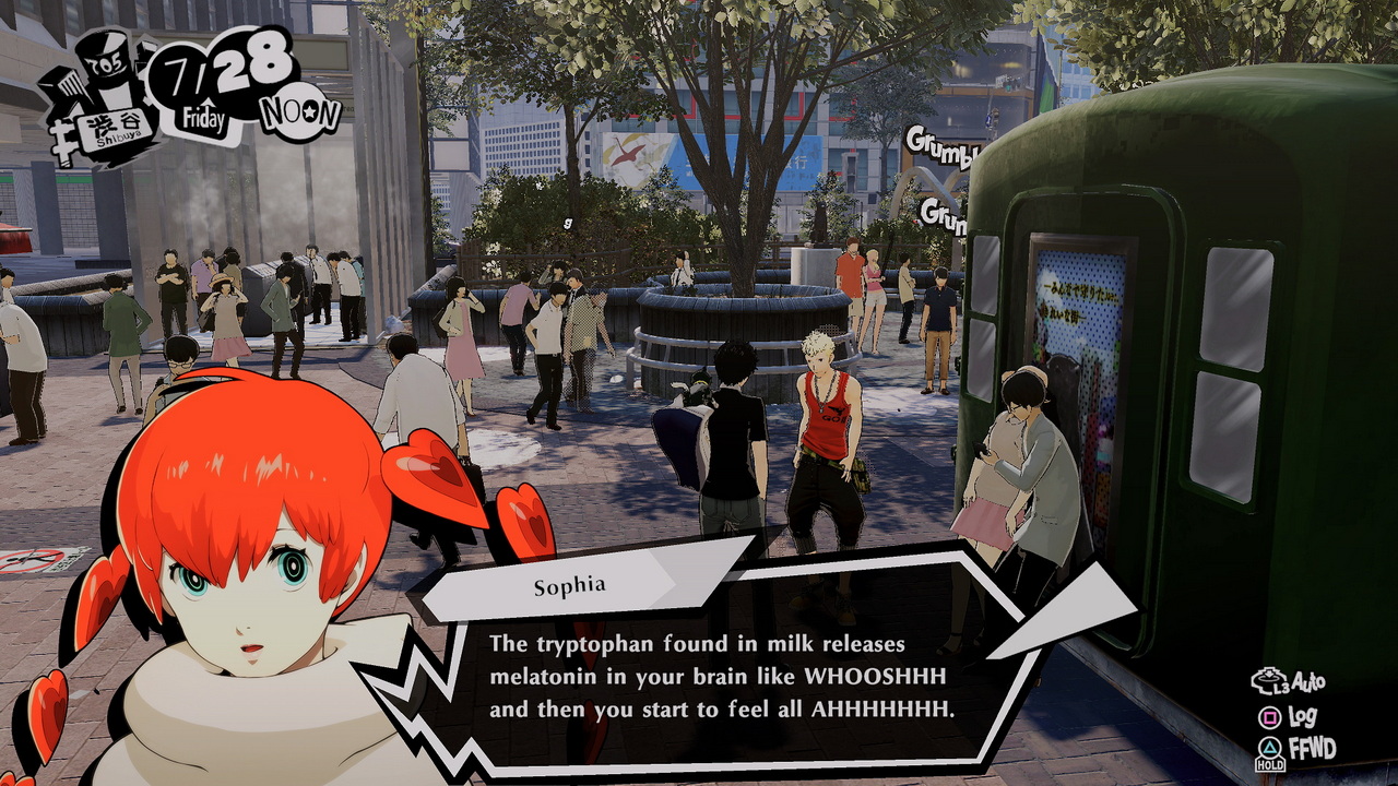 Γενικότερα, το σενάριο του τίτλου έχει γραφτεί με εντυπωσιακά λεπτομερή τρόπο, είτε όσον αφορά τη γενικότερη ανάπτυξη της ιστορίας, είτε την περαιτέρω εξέλιξη του κάθε χαρακτήρα. Οι διάλογοι παρουσιάζουν συνοχή καθ’ όλη τη διάρκεια των 70 περίπου ωρών που θα επενδύσετε στο παιχνίδι, και προσδίδουν ολοένα και περισσότερο βάθος στην σκιαγράφηση του κάθε χαρακτήρα. Μάλιστα, πέρα από τους ήδη γνωστούς ήρωες του Persona 5, εισάγονται δύο νέες προσωπικότητες καθοριστικές για την έκβαση της ιστορίας. Μέσα στις πρώτες, μόλις, ώρες της ιστορίας, ο τίτλος μας συστήνει την Sophia, μία προηγμένη μορφή τεχνητής νοημοσύνης, η οποία έχει προγραμματιστεί με μοναδική εντολή «το να είναι η σύντροφος της ανθρωπότητας». Βάσει αυτού, η Sophia γνωρίζει τον Joker και την συμμορία του και αποφασίζει να τους συντροφεύσει στη νέα τους περιπέτεια και να συμβάλλει στο να αλλάξουν τις καρδιές και να «σώσουν» τους Monarchs των Jails και όλων των υπόλοιπων ατόμων που έχουν παγιδευτεί στο Metaverse. Ενώ, εκ πρώτης όψεως, η ύπαρξη της Sophia στο σενάριο μοιάζει καθαρά υποστηρικτική, στην πορεία αποκαλύπτεται στον παίκτη πως οι απορίες της σχετικά με την ανθρώπινη λογική και τα συναισθήματα τοποθετούνται στους διαλόγους με τρόπο τέτοιο, που ο παίκτης μπαίνει στη διαδικασία να αναλογιστεί πολλαπλούς ηθικούς προβληματισμούς της μοντέρνας κοινωνίας. Πέρα από τροφή για σκέψη, η Sophia αποτελεί και τον νέο διαθέσιμο χαρακτήρα που προστίθεται στο roster των Phantom Thieves και η χρησιμότητα της είναι διττής φύσεως. Ενόσω βρίσκεται στον πραγματικό κόσμο, συνομιλεί με τη συμμορία μέσω των κινητών τηλεφώνων τους, ως μία τεχνητή νοημοσύνη που τους βοηθάει να βρουν στοιχεία για την κάθε υπόθεση με εντυπωσιακή ταχύτητα, συνιστώντας παράλληλα και το διαδικτυακό μαγαζί στο οποίο αποκτά πρόσβαση ο παίκτης και εξοπλίζεται με τις απαραίτητες προμήθειες, προτού βουτήξει στο αφιλόξενο Metaverse. Πέραν αυτού, όμως, σε κάθε εξόρμηση στα Jails, η Sophia είναι πλήρως διαθέσιμη και αποκτάει ανθρώπινη υπόσταση, αποτελώντας μία χρήσιμη προσθήκη στο σύνολο των διαθέσιμων χαρακτήρων.