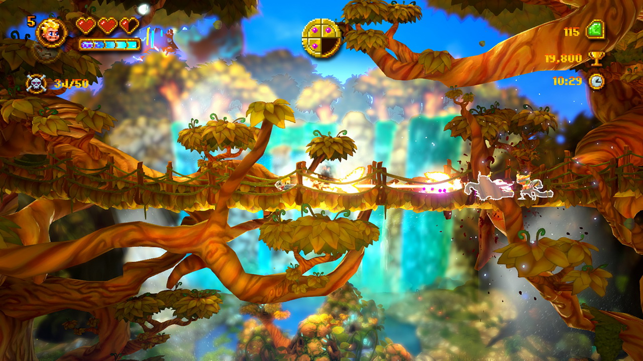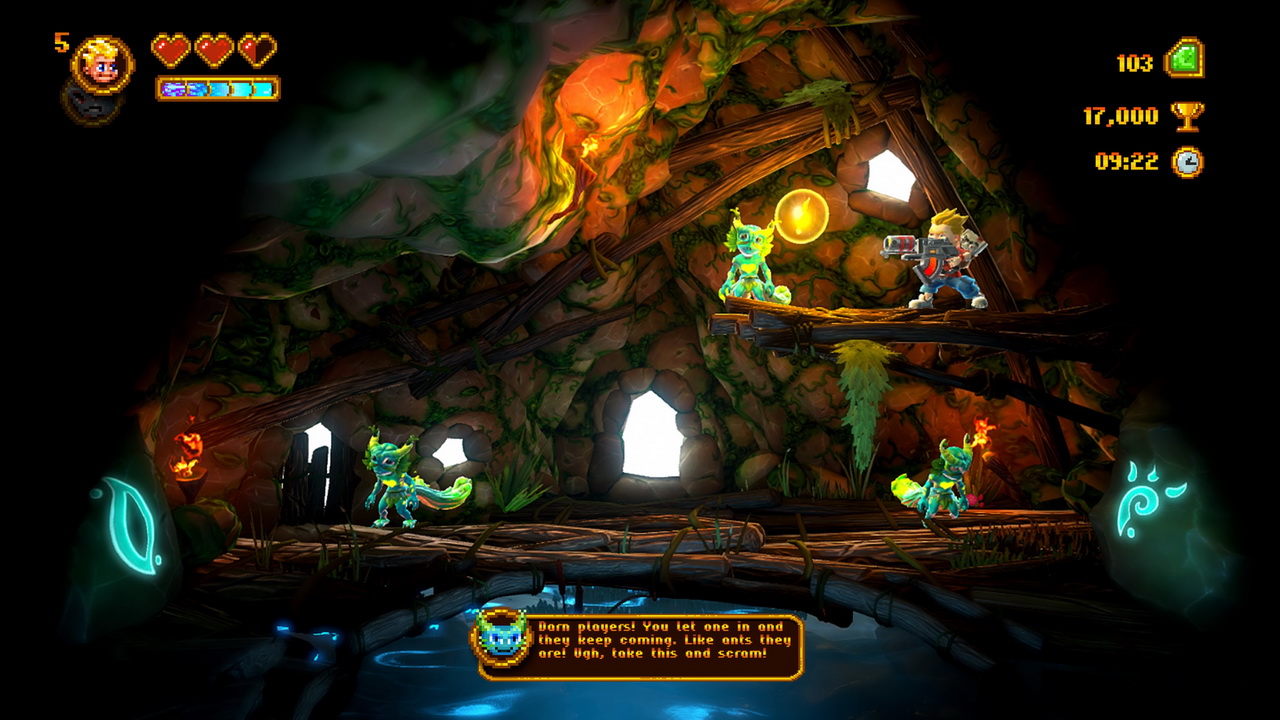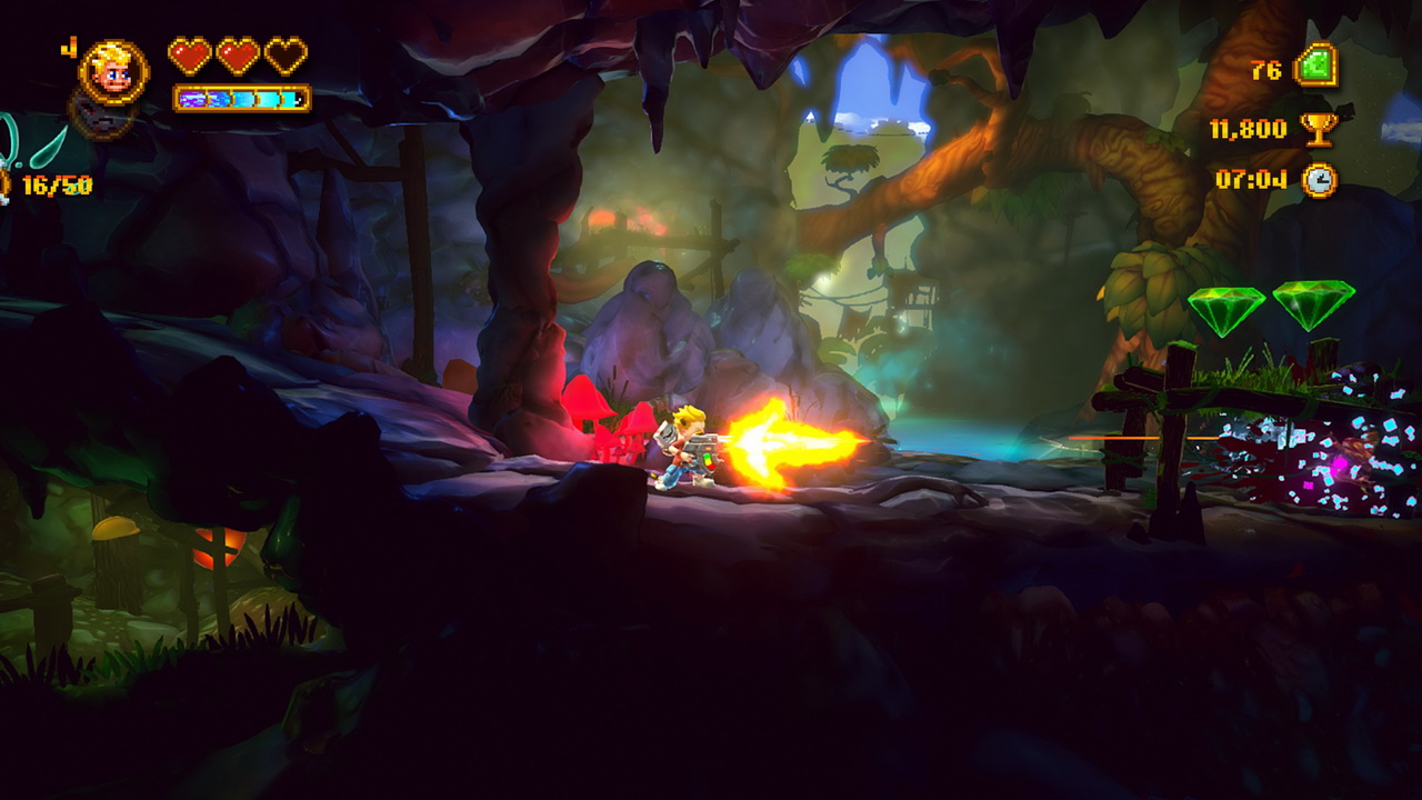 Κεντρικός ήρωας ο Rad, ένας δωδεκάχρονος ο οποίος λιώνει κυριολεκτικά στα videogames, τόσο που θα έλεγε κανείς ότι μοναδικός του φίλος είναι η ίδια η παιχνιδομηχανή του. Μία ξαφνική δίνη θα σταθεί η αιτία να απορροφήσει η τηλεόραση τον Rad και να βρεθεί μέσα στον κόσμο ενός εκ των παιχνιδιών που παίζει με μόνο σύντροφο (μαντέψτε) την κονσόλα του, η οποία αποκτά όνομα, φύλο και…στόμα μεταξύ άλλων. Ο Dusty λοιπόν, έχει μία περίεργη αίσθηση του χιούμορ και οι εκφράσεις που χρησιμοποιεί θα αναγκάσουν τους γονείς να χαμηλώσουν το επίπεδο καφρίλας αν πρόκειται να παίξει μικρό παιδί. Ακριβώς, εκτός από το επίπεδο δυσκολίας, υπάρχει και επίπεδο καφρίλας για να μπορούν να απολαύσουν όλοι το Rad Rodgers χωρίς ενδοιασμούς. Μέσα από τον κεντρικό χάρτη, οι δύο φίλοι θα ξεκινήσουν από το επίπεδο του First World και μέσα από 7 επικίνδυνες πίστες θα προσπαθήσουν να σώσουν τους κατοίκους της ζούγκλας και να επαναφέρουν την τάξη στον κόσμο σώζοντας τον παγιδευμένο φύλακα. Το gameplay θυμίζει όντως τα 2D side-scrollers που μεσουράνησαν κάπου μεταξύ των τελών της δεκαετίας του ‘80 και του μέσου της δεκαετίας του ’90, ενώνοντας το platforming με το shooting, με πολλές κρυφές περιοχές, power ups και ξέφρενη δράση. Αν και με περιορισμένο ammo, τα power ups που ενδυναμώνουν το όπλο του Rad είναι άκρως διασκεδαστικά για τον παίκτη και ιδιαιτέρως καταστροφικά για τους ανυποψίαστους εχθρούς. Το platforming καλύπτει ένα μεγάλο μέρος του gameplay και αν συνδυαστεί με ενδελεχή εξερεύνηση, ο παίκτης μπορεί να ανταμειφθεί με μπόλικα καλούδια αλλά και να ανακαλύψει καλά κρυμμένα easter eggs. Σε κάθε πίστα υπάρχουν χωροχρονικές ανωμαλίες και στα σημεία αυτά αναλαμβάνει δράση ο Dusty, ο οποίος με περιορισμένο ρεπερτόριο κινήσεων θα προσπαθήσει να επαναφέρει την ομαλότητα προκειμένου να μπορέσει να συνεχίσει ο Rad την πορεία του. Τα σημεία αυτά θεωρούμε ότι είναι και ένα από τα αδύναμα σημεία του τίτλου. Όσο ενδιαφέρουσα και πρωτότυπη είναι η προσέγγιση των δημιουργών άλλο τόσο επώδυνη είναι για το gameplay, καθότι ο Dusty είναι δυσκίνητος, αργός και χρησιμοποιεί μόνο τις γροθιές του καθώς περιηγείται μέσα σε αυτές τις ανωμαλίες.