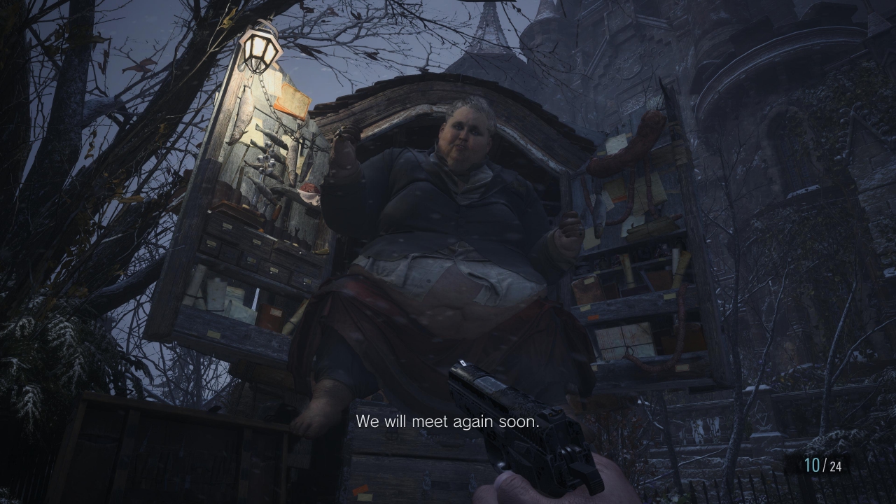 Μιλώντας για τον merchant, όσοι έχουν παίξει το Resident Evil 4 θα εκτιμήσουν την παρουσία του μιας και φέρνει στο μυαλό τον αντίστοιχο πωλητή που βρισκόταν στο ισπανικό χωριό του παιχνιδιού. Ο ρόλος του νέου χαρακτήρα είναι διευρυμένος συγκριτικά με του προκατόχου του, καθώς πέρα από την αγοραπωλησία όπλων, πυρομαχικών και άλλων αναλωσίμων, μπορεί να αναβαθμίσει τα όπλα αλλά και τις αντοχές του Ethan, παροτρύνοντας έτσι τον παίκτη να «χτενίζει» κάθε δωμάτιο για σπάνια και μη αντικείμενα. Ο χάρτης βοηθάει σε αυτή τη διαδικασία, μαρκάροντας με κόκκινο τα δωμάτια που περιέχουν αντικείμενα και με μπλε όσα δεν έχουν κάτι επιπλέον να προσφέρουν. Επομένως, όποτε ο παίκτης επιστρέφει στο χωριό με νέο εξοπλισμό που ξεκλειδώνει χώρους όπου μέχρι πρότινος δεν είχε πρόσβαση, είναι εύκολο να αναγνωρίσει τα σημεία χωρίς μπλέξιμο. Όσον αφορά στα όπλα και τον χειρισμό, ο Ethan ακόμη είναι… τσακωμένος με το σκόπευτρο κάθε όπλου κι όταν χρησιμοποιείται η αριστερή σκανδάλη για ζουμ, απλώς φέρνει το όπλο λίγο πιο κοντά στα μάτια κι ο παίκτης συνεχίζει να στοχεύει μέσω της ένδειξης στην οθόνη. Δεν υπάρχει θέμα ανακρίβειας στις βολές, απλώς δείχνει παράξενο. Το οπλοστάσιο του παίκτη θα περιλαμβάνει κλασικά κι αγαπημένα όπλα -πιστόλι, καραμπίνα κλπ- αλλά και κάποιες ευχάριστες εκπλήξεις. Όλα τα όπλα έχουν χρησιμότητα, ακόμη κι αν δε φαίνεται άμεσα – για παράδειγμα, το sniper rifle δίνεται στον παίκτη μέσα σε έναν από τους πιο κλειστούς χώρους του παιχνιδιού όμως λίγα λεπτά αργότερα αποδεικνύει πόσο χρήσιμο είναι.
