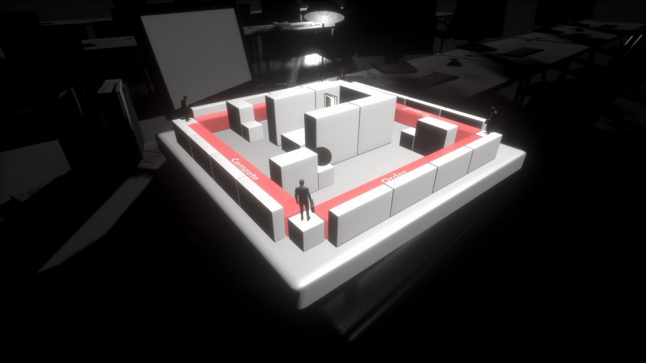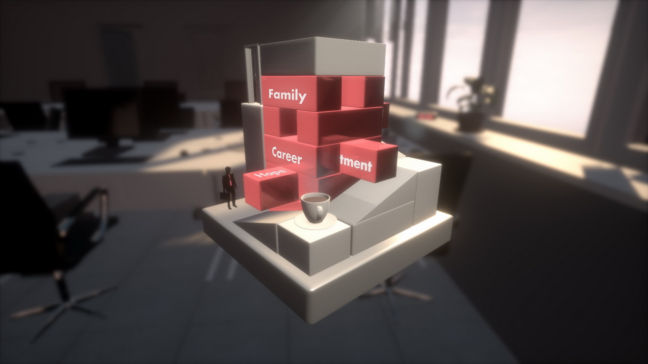 Τα επίπεδα χωρίζονται σε 6 ενότητες, με την καθεμιά να προσθέτει και κάποιο νέο μηχανισμό για να απασχολείται ο παίκτης, ενώ στα δύσκολα συνδυάζονται και όλοι. Στην αρχή τα πράγματα είναι απλά βεβαίως. Ένα δυο κομμάτια φεύγουν από τη μέση, πέφτουν σε πιο βολικό ύψος κάποια άλλα, ανοίγει ο δρόμος για τον πανικόβλητο εργαζόμενο, ο δρόμος προς την έξοδο. Αργότερα πρέπει να προσέχουμε πώς μοιράζουμε το βάρος καθώς τοποθετούμε και μετακινούμε κομμάτια, για να κάνουμε τα πάντα να δουλέψουν στο τέλος. Πιο μετά προστίθεται γυάλινα κομμάτια που σπάνε αν παραζοριστούν. Ενίοτε δεν φτάνουν απλές μετακινήσεις, χρειάζονται και επιτηδευμένες πτώσεις. Από ψηλά ενδεχομένως. Δεν ξεχνάμε επίσης πως, όπως σε άλλους εκπροσώπους του είδους, η πορεία προς την έξοδο είναι ο βασικός στόχος. Υπάρχουν όμως και κάποια σκόρπια νομίσματα, εννοείται για να αναγκάσουν τον παίκτη να κάνει διαφορετικά πλάνα που, εκ των πραγμάτων, θα κάνουν και τη ζωή του δυσκολότερη. Χρειάζονται βέβαια κάμποσα από αυτά τα νομίσματα, αφού με αυτά ξεκλειδώνονται και τα δυσκολότερα επίπεδα. Όσο τα σκεφτόμαστε αυτά στον πραγματικό κόσμο, έχουν φοβερό ενδιαφέρον. Στον εικονικό η μινιμαλιστική αισθητική κερδίζει, μάλιστα όχι παρά αλλά και χάρη στην ιαπωνική pop της δεκαετίας του 1980. Χωρά και λίγη σάτιρα με ανησυχίες εταιρικού επιπέδου, που εκφράζεται με σημειώματα περί εταιρικής νοοτροπίας πριν από κάθε επίπεδο και με σκόρπιες, όχι πάντα ασύνδετες λέξεις σε ορισμένα από τα τουβλάκια που συνθέτουν το επίπεδο.