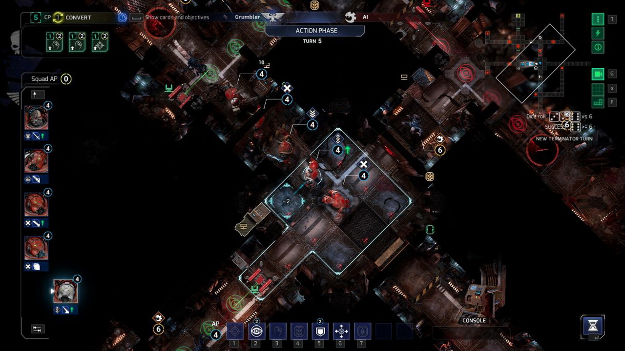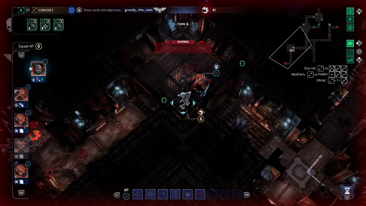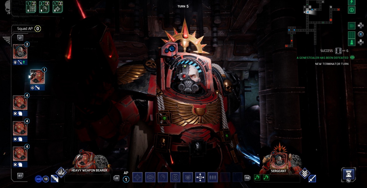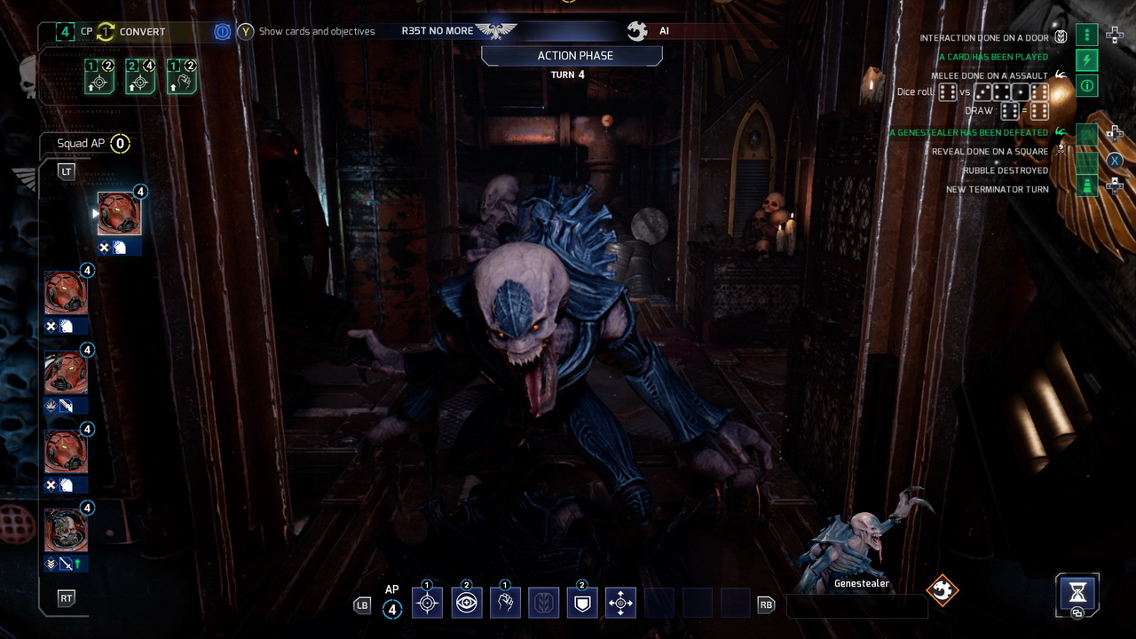 Και αυτός είναι ο βασικός πυλώνας του Space Hulk άλλωστε, η θεμελιώδης αρχή και αντίθεση. Οι Terminators είναι πανίσχυροι και μπορούν να εξολοθρεύσουν οτιδήποτε βρεθεί μπροστά τους, αλλά κυριολεκτικά «μπροστά τους». Ο κάθε Space Marine έχει 4 action points και η παραμικρή κίνηση απαιτεί τουλάχιστον ένα, ακόμα και η αλλαγή διεύθυνσης. Οι Genestealers από την άλλη έχουν 6 AP και είναι απείρως πιο ευκίνητοι, αλλά πρέπει να έρθουν σε απόσταση melee για να έχουν την οποιαδήποτε πιθανότητα να προξενήσουν ζημιά. Διαφορετικά classes και ικανότητες δίνουν μια κάποια ποικιλία στη δράση, αν και η μεγαλύτερη τομή δεν είναι άλλη από το σύστημα καρτών που έχει ενσωματώσει η ομάδα ανάπτυξης. Οι θιασώτες του tabletop θα κοιτάξουν περίεργα, αλλά εν τέλει πρόκειται περί μιας εξαιρετικά έξυπνης ιδέας, η οποία υφαίνεται με εξίσου έξυπνο τρόπο στο gameplay. Πιο συγκεκριμένα, πέρα από τα action points του κάθε Space Marine, ο παίκτης μπορεί να χρησιμοποιήσει κάρτες είτε για να ευνοήσει την έκβαση μιας δράσης (π.χ. αυξημένες πιθανότητες ή σίγουρο hit για το επόμενο melee/ranged attack), είτε να τις «κάψει» για να αποκτήσει περισσότερα AP σε ένα pool που μπορεί να το μοιραστεί ολόκληρη η ομάδα. Το πιο σημαντικό είναι ότι όλο αυτό το σύστημα διαθέτει ένα έξυπνο «φρένο», που αποτρέπει την υπερβολική εκμετάλλευση αυτού του μηχανισμού με πολύ μεγάλη επιτυχία, καταφέρνοντας να κρατήσει μόνο τα θετικά από το ασυγχώρητο RNG, αφού στο Warhammer 40K ο Αυτοκράτορας μπορεί να προστατεύει, στο Space Hulk Tactics όμως το RNG αγνοεί επιδεικτικά τον αθάνατο αυτοκράτορα και δεν συγχωρεί τίποτα και κανέναν.