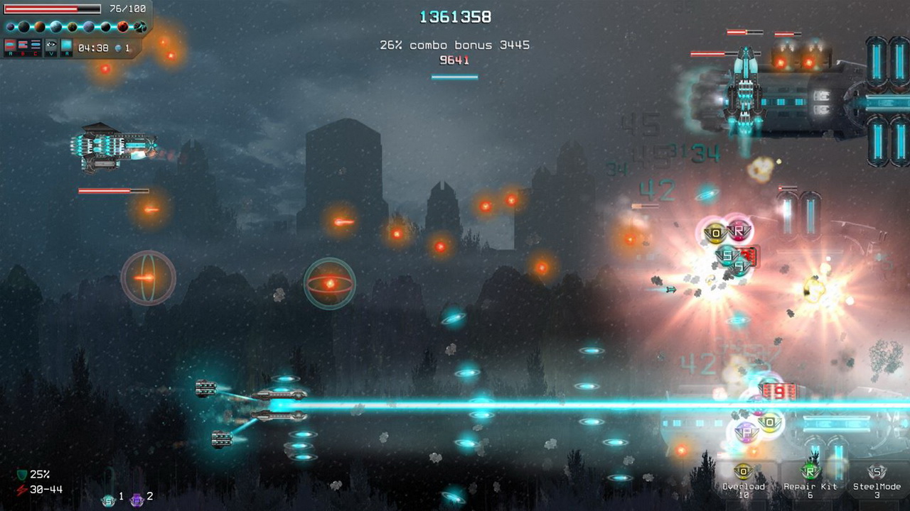 Έτσι περνάμε στην πρώτη πράξη του Steel Rain X, το shooting. Ο τίτλος λειτουργεί ως κλασικό sidescrolling shooter, προσφέροντας έξι διαφορετικά firing modes, που αλλάζουν και ενδυναμώνονται μέσω συγκεκριμένων power ups εντός του επιπέδου, περισσότερα ιπτάμενα αντικείμενα για προσωρινά buffs, ασπίδες κ.λπ., τεράστια ποικιλία αντιπάλων και διαφορετικές μορφές του σκάφους σας. Αυτές είναι τρεις στον αριθμό και καταφέρνουν να αλλάξουν κι άλλο κάθε ένα από τα firing modes που χρησιμοποιείτε εκείνη τη στιγμή. Η μεταμόρφωση γίνεται κατά βούληση και προσφέρει μια μορφή για επίθεση σε μεγάλη εμβέλεια με γρήγορες ριπές, πιο αργό ρυθμό βολών αλλά δυνατότερες επιθέσεις και μορφή χωρίς καμία επιθετική ικανότητα, αλλά με δυνατότητα προσέλκυσης όλων των power ups και γενικά ευεργετικών αντικειμένων που βρίσκονται εκείνη τη στιγμή στην οθόνη. Το τελευταίο, πέραν του προφανούς πλεονεκτήματος, βοηθάει από σπόντα λίγο ακόμα τον παίκτη, μιας και η οθόνη σπανίως είναι αρκετά καθαρή για να είστε απόλυτα αισιόδοξοι πως όλα θα πάνε καλά. Αντίπαλοι, ριπές, power ups, coins και ένας σκασμός εφέ μπουκώνουν συχνά το κάδρο, οπότε η γρήγορη εκκαθάρισή του από, έστω, ένα από τα στοιχεία που δημιουργούν μπέρδεμα είναι παραπάνω από καλό. Το άξιο προσοχής είναι πως ο τίτλος φροντίζει να αλλάξει χρώμα στις ριπές των αντιπάλων σας όταν οι δικές σας αλλάξουν απόχρωση, λόγω κάποιου power up, και το κάνει ακριβώς προσπαθώντας να κρατήσει την κατάσταση ξεκάθαρη. Με δεδομένο το προηγούμενο μπούκωμα, τελικά δεν το καταφέρνει, αλλά μας έκανε θετική εντύπωση η συγκεκριμένη λεπτομέρεια.