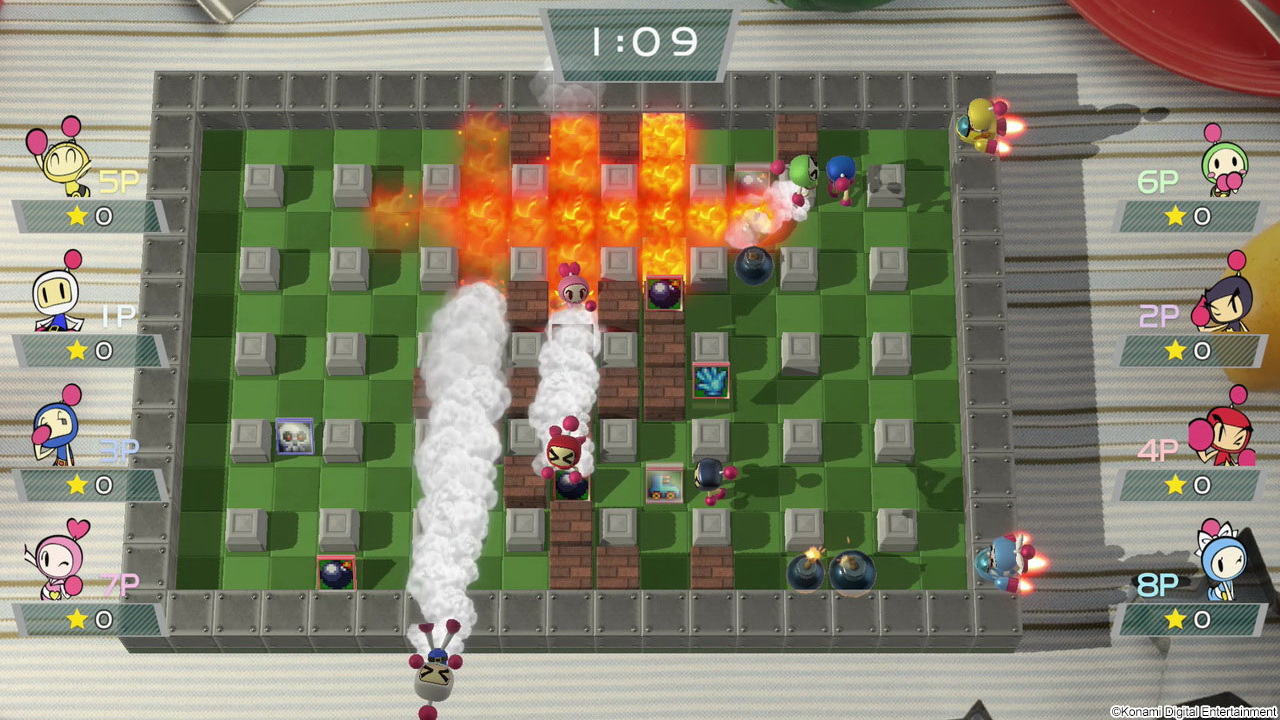 Επιστρέφοντας στα του Battle Mode, εδώ όλα είναι ανοιχτά αφού έως και 4 παίκτες μπορούν να βρεθούν αντιμέτωποι online, εκτός αν προτιμήσουν την οδό του co-op. Οι online αναμετρήσεις παρέχουν ευελιξία όταν δεν είναι ranked, όπου και τα πράγματα σοβαρεύουν απότομα. Σε online περιβάλλον όμως συναντούμε και την πιο ασταθή συμπεριφορά, με προβληματικό συγχρονισμό των εξελίξεων ακόμη και όταν ο παίκτης φιλτράρει τους πιθανούς αντιπάλους με βάση την ποιότητα της σύνδεσης. Άρα στρεφόμαστε στο τοπικό multiplayer, εκεί που ξέρουμε ότι το Bomberman βρίσκεται στο στοιχείο του. Εδώ μάλιστα επιτρέπεται και η συμμετοχή έως 8 παικτών, είτε με 8 Joy-Con στην ίδια κονσόλα και σύνδεση στην τηλεόραση (το όριο είναι οι 4 σε portable mode για προφανείς λόγους) ακόμη και με ασύρματη σύνδεση 4 συστημάτων μαζί.