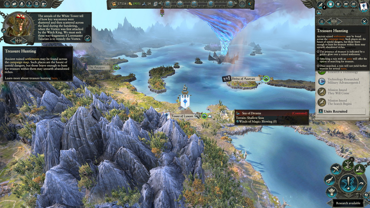 Το ίδιο το campaign, με τίτλο Eye of the Vortex, επικεντρώνεται στη μαγική δίνη που βρίσκεται στο κέντρο της ηπείρου των High Elves, η οποία απορροφά τη μαγική ενέργεια από όλον τον πλανήτη, εμποδίζοντας έτσι τις ορδές των δαιμόνων του Χάους από το να ανοίξουν ξανά ρήγματα από τη διάστασή τους προς εκείνη των θνητών. Ωστόσο, η εμφάνιση του κομήτη με τις δύο ουρές, η οποία στον κόσμο του Warhammer συνδέεται με συνταρακτικά γεγονότα, ωθεί τις διάφορες φυλές στην προσπάθεια να ελέγξουν ή να καταστρέψουν το Vortex, για τους δικούς της σκοπούς η καθεμία. Παρ' όλες τις διαφορές τους σε επίπεδο αισθητικής και στρατηγικής και τα τέσσερα playable races προσπαθούν να ολοκληρώσουν μια σειρά τελετών που θα επηρεάσουν το Vortex με κάποιον τρόπο. Καθεμία από τις τελετές αυτές απαιτεί τη συγκέντρωση αντικειμένων: επιγραφές, warpstones, way-fragments, πάπυροι, όπως και αν λέγονται η λειτουργία τους είναι πανομοιότυπη: συλλέγονται από πόλεις και quests και επενδύονται σε μια αλυσίδα από πέντε τελετές. Καθεμία από αυτές διαρκεί κάποιες σειρές, όταν ολοκληρωθεί δίνει κάποιο bonus και ξεκλειδώνει την επόμενη στη σειρά.
