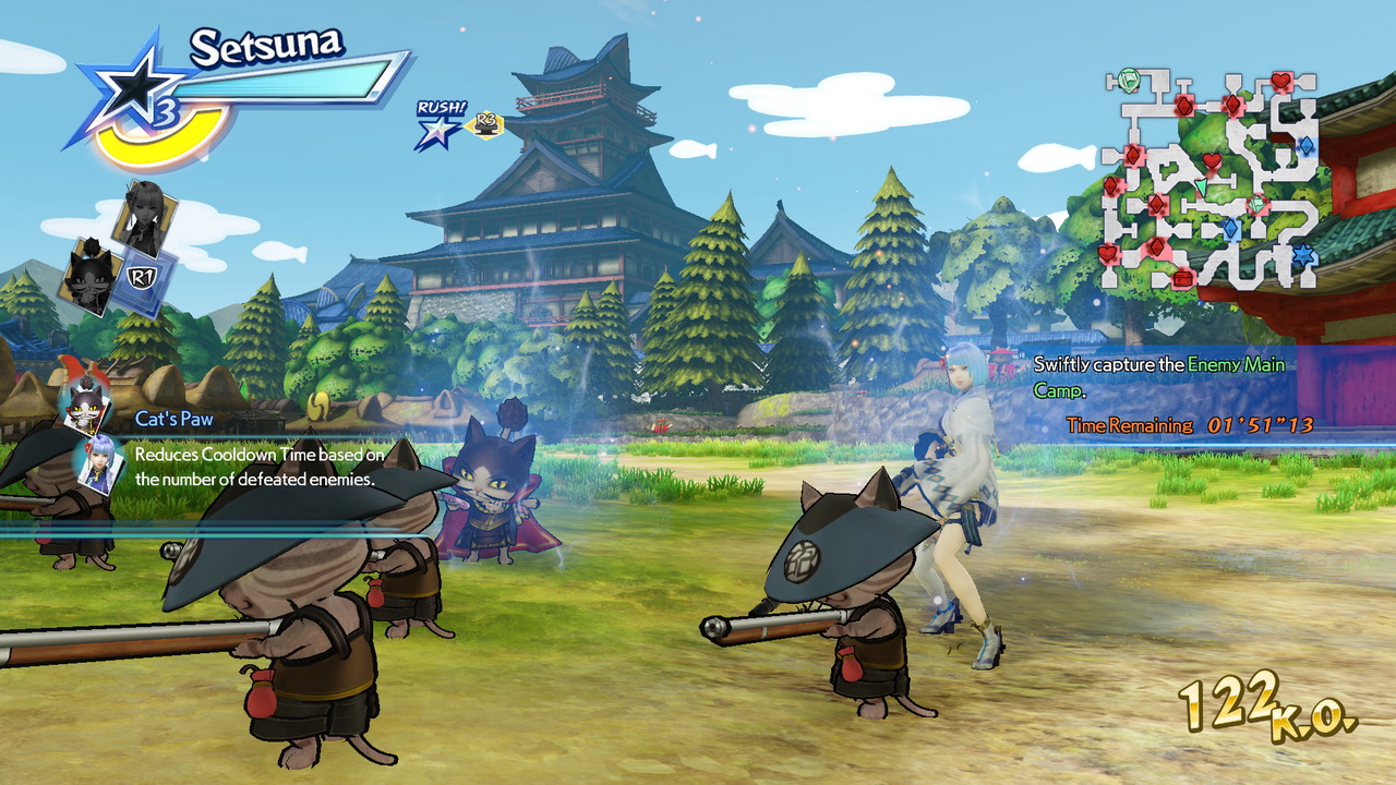 Ναι, πρέπει να σωθεί ένας άγνωστος κόσμος, τηλεμεταφέρονται όλοι οι γνωστοί άγνωστοι, κάτι πάει στραβά και καταλήγουν αλλού γι’ αλλού, μαθαίνουν ότι η βασιλική οικογένεια που προσπαθεί να σώσει τον κόσμο είναι χωρισμένη σε τρεις διαφορετικές παρατάξεις που κοντράρονται και καθεμιά καπαρώνει κάποιους από τους 27 «ξένους» ήρωες, 17 εκ των οποίων είναι επιλέξιμοι σε πρώτη φάση. Δεν υπάρχει πραγματικός λόγος να πάρει κανείς στα σοβαρά την ιστορία ενός τίτλου Warriors, με ελάχιστες εξαιρέσεις ίσως, αλλά εδώ δεν γίνεται κι αλλιώς αφού μόνο το story campaign υφίσταται στο παιχνίδι. Κάθε άλλο mode το ξεχνάτε. Έτσι κι αλλιώς η Omega Force είναι απασχολημένη με την ανάπτυξη του Dynasty Warriors 9 που θα φέρει -επιτέλους- και ανανέωση της μηχανής γραφικών, διότι αυτό που ζούμε εξακολουθεί να έχεις τις βάσεις του στην προηγούμενη γενιά hardware. Τουλάχιστον εδώ, η ομάδα έχει προσπαθήσει να τραβά την προσοχή με την παλέτα, διότι είναι σίγουρο ότι η δομή των χαρτών δεν ακολουθεί ούτε τα καλά παραδείγματα της σειράς Musou. Αφού το campaign είναι το μόνο πράγμα να μας απασχολήσει, η Koei Tecmo αποφάσισε να το τραβήξει από τα αυτιά και να δει τι θα γίνει. Διότι, αν τα βάλει κανείς κάτω, κάθε playthrough διαρκεί λίγες ώρες, ειδικά μετά τον αρχικό εγκλιματισμό του παίκτη κατά το πρώτο πέρασμα. Καθεμιά από τις τρεις παρατάξεις που αναφέρθηκαν έχει ουσιαστικά τη δική της παραλλαγή στην ιστορία, και δίνει πρόσβαση σε διαφορετικούς χαρακτήρες για να γνωρίσει ο παίκτης. Η επιλογή χαρακτήρα από τον ίδιο τον παίκτη πάντως, καθορίζει ουσιαστικά σε ποια πλευρά θα βρεθεί και με ποιους μπορεί να αναπτύξεις προσωπικές σχέσεις. Μπορεί να μην είναι απόλυτη η ελευθερία, αλλά λογικό είναι να μην περιμένουμε και ξεχωριστή πορεία, με όλα τα ενδεχόμενα ανοιχτά, για κάθε χαρακτήρα. Και η Koei Tecmo, αντιλαμβανόμενη το lore κάθε πλευράς, φαίνεται να έχει κάνει λογικά ταιριάσματα. Ακόμη και ένας από τους χαρακτήρες είναι ο Oda Nobunyaga. Όχι. Δεν πρόκειται για ορθογραφικό λάθος. Μιλάμε όντως για γατοέκδοση του Oda Nobunaga.