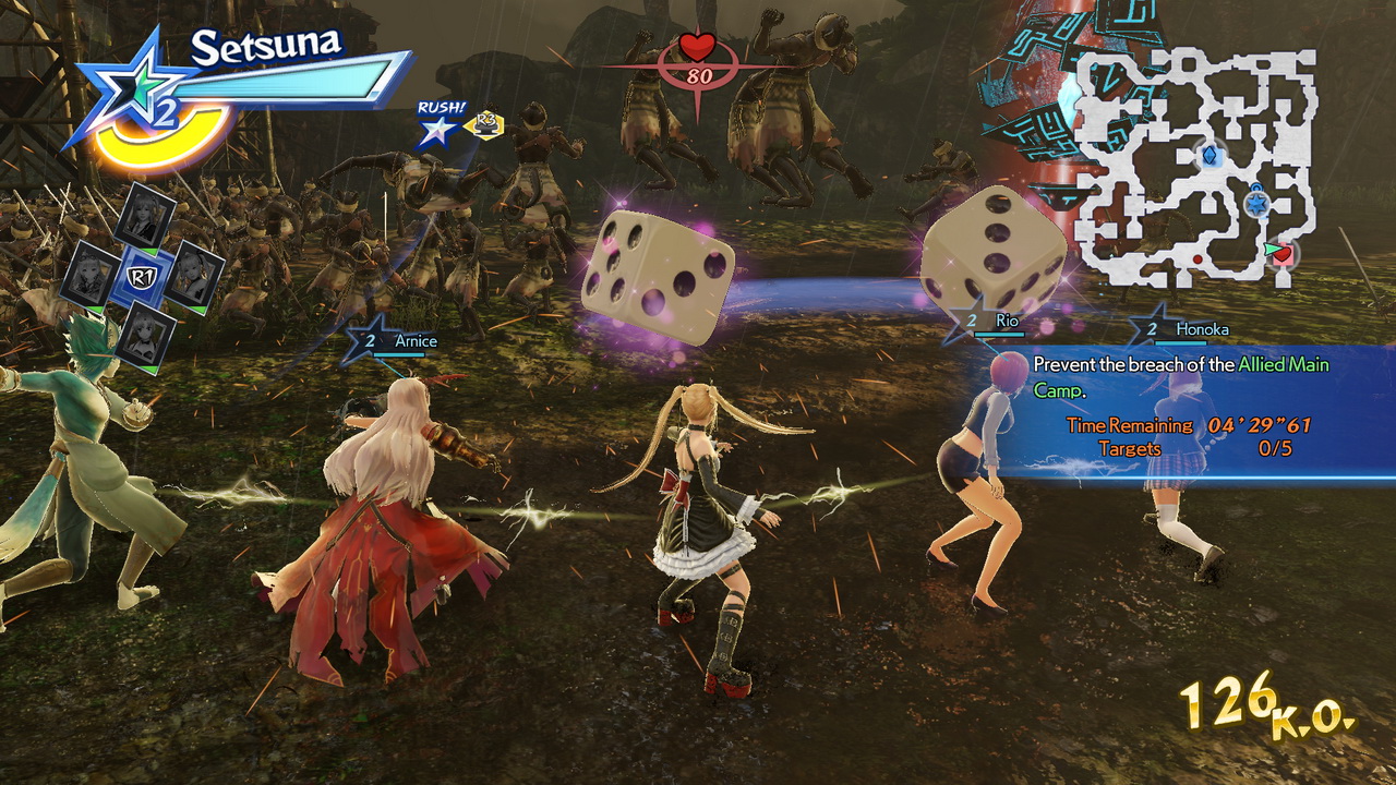 Και τι θα βρούμε στο loot; Το πιο σημαντικό, στα χαρτιά, είναι κάρτες, που παίρνουν το ρόλο των αναβαθμίσεων. Οι αναβαθμίσεις όπλων απουσιάζουν μιας και δεν είναι όλοι οι χαρακτήρες συνηθισμένοι σε όπλα, οπότε δεν θα είχε ιδιαίτερο νόημα η όλη ιδέα. Το σκεπτικό είναι ότι μαζεύονται κάρτες διαφορετικής βαρύτητας, σπανιότητας και ιδιοτήτων, συνδυάζονται για να δημιουργήσουν νέες κ.λπ. Το κακό βέβαια είναι ότι δεν έχουν πραγματικά σημαντικές επιπτώσεις πέραν κάποιου σημείου και, το χειρότερο, το σύστημα σύνθεσης είναι παντελώς απαράδεκτο, ικανό να δώσει στον παίκτη απλή, ακόμη και ύστερα από σύνθεση πολλαπλών σπανιότερων. Κι επειδή δεν υπάρχει καμία καθοδήγηση ως προς το θέμα, ούτε η Omega Force φαίνεται να προσποιείται ότι παίρνει στα σοβαρά το συγκεκριμένο μηχανισμό.