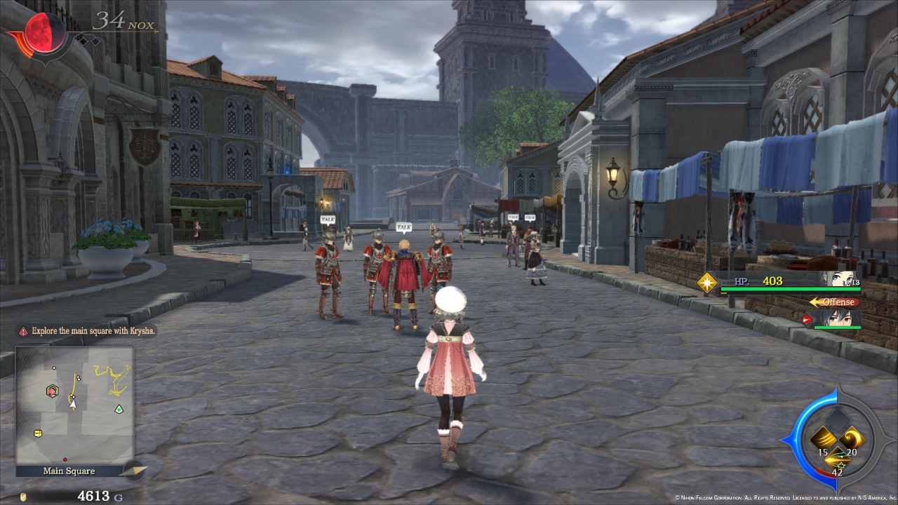 Στο κομμάτι της εξερεύνησης, το Ys IX: Monstrum Nox είναι μεν ανοιχτό και ελεύθερο, όμως όχι όπως τα μοντέρνα παιχνίδια που έχουμε συνηθίσει. Μέσα σε μόλις λίγα λεπτά, ο παίκτης μπορεί να διασχίσει περπατώντας όλη την πόλη του Balduq από δρόμους ή ταράτσες, όμως ευτυχώς, υπάρχουν σημεία για fast travel που εξαλείφουν την ανάγκη αυτή όταν ο παίκτης πραγματικά βιάζεται να ολοκληρώσει μια αποστολή. Και πράγματι, σε ορισμένα side quests που απαιτούν ο Adol να επισκεφτεί διάφορα σημεία της πόλης για να πάρει/δώσει κάτι και μετά να πάει αλλού, το fast travel είναι θεόσταλτο. Από την άλλη, όποιος θέλει να θαυμάσει τα πανέμορφα δρομάκια, κτίρια, πλατείες ή το αμφιθέατρο της Balduq (ή κάποια περιοχή εκτός των τειχών της πόλης), μπορεί να το κάνει χωρίς να απαιτείται υπερβολικός χρόνος. Κάποιες αποστολές απαιτούν την είσοδο σε π.χ. υπονόμους, τα οποία πρακτικά είναι dungeons όμως ο παίκτης μπορεί να τα επισκεφτεί ξανά και ξανά, για να μαζέψει υλικά ή εμπειρία. Δεν είναι όλα τα σημεία του χάρτη διαθέσιμα εξ αρχής, βέβαια, και όσο η ιστορία προχωράει τότε ξεκλειδώνονται επιπλέον περιοχές. Ολοκληρώνοντας αποστολές (κύριες και μη) ή πολεμώντας εχθρούς που τυχαία συναντά στην πόλη, ο παίκτης μαζεύει πόντους για να ξεκλειδώσει μια πύλη και να επισκεφτεί το Grimwald Nox, τη διάσταση από όπου προέρχονται οι δαίμονες. Εκεί, θα πρέπει να προστατεύσει τον κρύσταλλο από τις ορδές των δαιμόνων και, εφόσον επιτύχει, η πύλη εξαφανίζεται, ένα νέο κομμάτι της πόλης ξεκλειδώνεται και η ιστορία προχωράει. Στην ουσία, τα Grimwald Nox είναι τα raids που έχουμε συνηθίσει στα υπόλοιπα Ys. Εδώ βρίσκονται μερικές από τις πιο έντονες μάχες, με ντουζίνες εχθρών κάθε δυναμικότητας να επιτίθενται ασταμάτητα. Ο παίκτης έχει την επιλογή να επενδύσει σε ευκολίες μέσω της ταβέρνας, όπως δολώματα, που κάνουν ευκολότερες τις μάχες. Δεν είναι ιδιαίτερα δύσκολες, ακόμη και στις υψηλότερες δυσκολίες, όμως είναι μια καλή ευκαιρία να πειραματιστεί κάποιος με combos ή απλά να… ξεδώσει πάνω στους άτυχους δαίμονες.