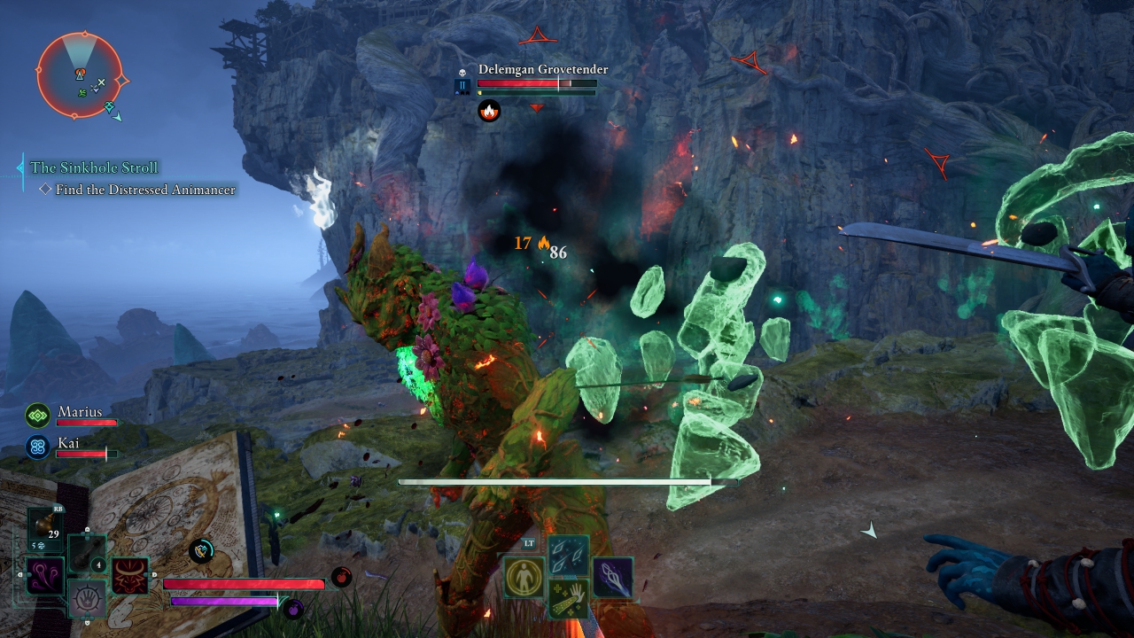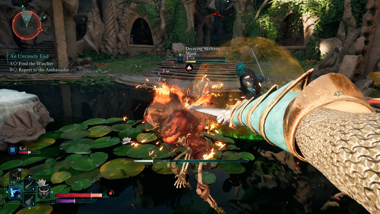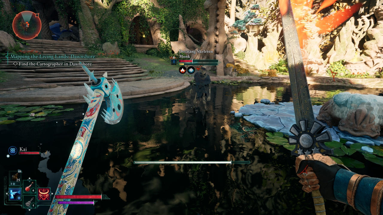 Αυτό διότι ο παίκτης ανά πάσα στιγμή μπορεί να χρησιμοποιήσει spell books και ραβδιά, τα οποία επιτρέπουν τη χρήση μαγείας δίχως απαραίτητα να έγινε επένδυση στα wizard skills, όμως κάποια βιβλία απαιτούν skills για να ξεκλειδωθούν όλα τα spells που παρέχουν. Επιπλέον, τα ραβδιά επιτρέπουν basic attacks και δεν καταναλώνουν Essence (MP), οπότε ο wizard δεν είναι πάντα «δέσμιος» του Essence και μπορεί να αξιοποιεί το build δίχως να χρειάζεται διαρκώς αναπλήρωση. Βέβαια, το ωραίο της υπόθεσης είναι η μίξη. Παίξαμε με έναν fighter που δεξιά κρατούσε τσεκούρι και αριστερά spellbook, ενώ χάρη στα tank/dodge skills, ήταν ανθεκτικός. Μπαίναμε στη μάχη παγώνοντας μεγάλες εκτάσεις και εχθρούς, τους οποίους διαλύαμε με το τσεκούρι κι αν κάτι ξέφευγε, με ένα dodge ήμασταν εκτός απόστασης βολής. Από την άλλη, δοκιμάσαμε κι ένα build με ξίφος και δόρυ, ώστε να κλείνουμε την απόσταση χρησιμοποιώντας το δόρυ και όταν φτάσουμε κοντά, να κάνουμε σερί επιθέσεων με το πολύ πιο γρήγορο σπαθί. Υπάρχουν και έξτρα μηχανισμοί, όπως η δυνατότητα να παγώσουμε το νερό, ενώ π.χ. το lifesteal spell δεν λειτουργεί σε σκελετούς αφού είναι ήδη νεκροί. Το πώς συνδυάζεται ο εξοπλισμός με τα skills είναι φανταστικό ατού του Avowed, παροτρύνοντας τον παίκτη να πειραματιστεί. Μέσα σε αυτά προστίθενται slots για πανοπλία και αξεσουάρ, που μπορούν να προσφέρουν επιπλέον δυνατότητες. Για παράδειγμα, μια χρήσιμη ασπίδα αναπλήρωνε HP την ημέρα και Essence τη νύχτα, βοηθώντας να μην βασιζόμαστε τόσο σε potions και φαγητά.