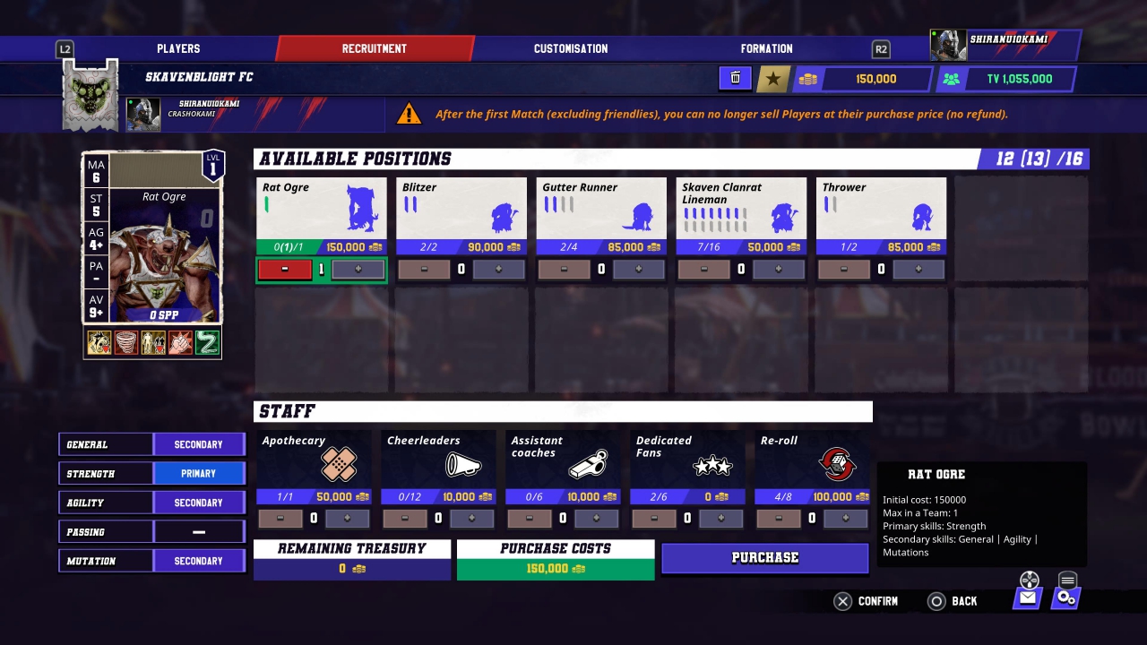 Ταυτόχρονα, ένας παίκτης με πολλά Skills και εμπειρία μπορεί να αναχθεί σε Star Player, αν συνεισφέρει διαρκώς στην ομάδα με τους πλέον χρήσιμους τρόπους (touchdowns, KO κλπ) και παράλληλα, ανεβαίνει η αξία του αν τελικά ο προπονητής (παίκτης) θέλει να τον πουλήσει. Με τα χρήματα που αποκτώνται από αγώνες ή πωλήσεις παικτών, μπορούν να αγοραστούν άλλοι παίκτες (υπάρχει όριο ανά θέση) ή να ενισχυθεί η ομάδα με άλλους τρόπους, όπως επιπλέον μαζορέτες που προσφέρουν bonus σε κάθε σέντρα. Δεδομένου ότι υπάρχει μεγάλη ελευθερία στο customization, οι παίκτες θα δημιουργήσουν την ομάδα των ονείρων τους, επιλέγοντας χρώματα στολής, λάβαρο, διακόσμηση πανοπλίας, πανοπλία που διαφέρει από θέση σε θέση (και κάθε κομμάτι εξοπλίζεται ξεχωριστά, για πάρα πολλούς συνδυασμούς) αλλά και εμφάνιση μαζορέτας, προπονητή και μπάλας. Είναι πάρα πολύ πιθανό δύο ομάδες ίδιας φυλής να παραταχθούν στο γήπεδο και να δείχνουν εντελώς διαφορετικές. Πάλι όμως, το παιχνίδι δεν επιτρέπει στον παίκτη να χαρεί πλήρως τις ξεχωριστές αυτές στιγμές. Από τη μία, οι σκηνές με τις μαζορέτες έχουν παράξενες μεταβάσεις από πλάνο σε πλάνο, όπως και οι σκηνές πανηγυρισμών μετά από μια νίκη, οι οποίες κόβονται απότομα και ο παίκτης μεταφέρεται σε ένα μενού. Λείπει το «γυάλισμα» από το παιχνίδι και φαίνεται πολύ συχνά, σε διάφορα σημεία.