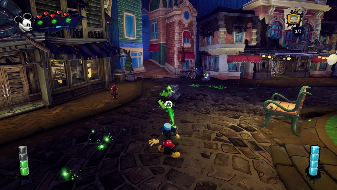 Το μεγαλύτερο μέρος του Epic Mickey: Rebrushed εννοείται ότι εξελίσσεται σ’ έναν τρισδιάστατο κόσμο μ’ ένα πολύ ξεκάθαρο 3D platforming, το οποίο όμως το νιώσαμε ελαφρώς ξεπερασμένο. Πιστεύουμε ότι σε αυτό συμβάλει και το γεγονός ότι παρ’ ό,τι δόθηκαν καινούργια skills στον Mickey, τόσο στον τομέα του πώς κινείται (Dash), αλλά και στις μάχες (Ground Pound), καταλήγουμε να χρησιμοποιούμε ελάχιστες νέες κινήσεις. Αυτό έχει να κάνει με το γεγονός ότι δεν υπάρχουν αρκετά απαιτητικά και πολύπλοκα σημεία που θα μας ωθούσαν να χρησιμοποιήσουμε τις νέες μας ικανότητες, με εξαίρεση φυσικά το sprint το οποίο χωρίς υπερβολή το θεωρούμε δώρο Θεού. Σ’ ένα παιχνίδι που στηρίζεται τόσο πολύ σε collectibles, στο ψάξιμο του περιβάλλοντος και σε fetch quests, το να μπορούμε να τρέξουμε μας διευκόλυνε τη ζωή στον μέγιστο βαθμό. Ένα άλλο καλό νέο αποτελεί το γεγονός, ότι η άκρως προβληματική κάμερα του αυθεντικού game έχει διορθωθεί πλήρως και αν εξαιρέσουμε 1-2 στιγμές που μας δυσκόλεψε ελαφρώς, η συνολική εμπειρία είναι θετικότατη. Αυτό και μόνο, σε συνδυασμό με τον ξεκάθαρα αναβαθμισμένο οπτικό τομέα, αποτελούν κατά την άποψή μας τα πλέον βαριά χαρτιά ώστε να προχωρήσει κάποιος που αγάπησε τον αυθεντικό τίτλο σε μία άμεση αγορά του εν λόγω remake.