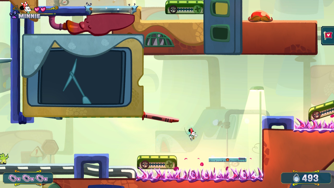 Αυτό μπορεί να έχει ως αποτέλεσμα οι απαιτητικοί παίκτες να νιώσουν σε κάποια στοιχεία ότι δε βλέπουν κάτι το ιδιαίτερο και ειδικά στην αρχή όπου αισθανθήκαμε έντονα τα κενά σημεία σε κάποιες περιοχές και την ελάχιστη ποικιλία στον τομέα των εχθρών. Γενικότερα υπάρχει μία ανισορροπία ανάμεσα στα έντονα platfmorming επίπεδα και στις πιο βασικές και flat εμπειρίες, αλλά από τη μέση και μετά τα πράγματα είναι εμφανώς καλύτερα. Επίσης μας άρεσε πολύ η αισθητική της μετάβασης από περιοχή σε περιοχή, η οποίες ναι μεν ξεχωρίζουν μεταξύ τους με τα διαφορετικά τους χρώματα, αλλά κρατάνε και κοινά στοιχεία με αποτέλεσμα να νιώθουμε ότι όλα ανήκουν στον ίδιο κόσμο, χωρίς να μοιάζουν όμως πολύ. Τα εξαιρετικά ομαλά animations σε συνδυασμό με το εθιστικό wall jump δημιουργούν μία ιδιαίτερα θετική ροή ως προς το gameplay και υπάρχουν όντως σημεία που ενδεχομένως να δυσκολέψουν και πιο έμπειρους παίκτες. Βέβαια, η συνολική εμπειρία θα επηρεαστεί πλήρως από την επιλογή των παικτών για το πόσες καρδιές θέλουν να έχει ο χαρακτήρας τους, ο οποίος μπορεί να γίνει μέχρι και άτρωτος. Είναι ξεκάθαρο ότι ο τίτλος έχει δημιουργηθεί με φόντο να μπορεί να παιχτεί από όλες τις ηλικίες και ειδικά σε co-op θα το προτείναμε ανεπιφύλακτα σε οικογένειες σαν παιχνίδι. Το Disney Illusion Island μπορεί να παιχτεί μέχρι και με 4 παίκτες συγχρόνως, το οποίο μπορεί να γίνει λίγο χαοτικό, αλλά παραμένει μία όμορφη διαδικασία, εφόσον κάποιος δεν είναι σούπερ ικανός με αποτέλεσμα να αφήνει τους υπόλοιπους πίσω. Ο καθένας παίκτης είναι ελεύθερος να επιλέξει το πόσες καρδιές θέλει να έχει, ενώ υπάρχουν και κάποιες μικροκινήσεις όπως π.χ. η αγκαλιά μεταξύ των παικτών η οποία προσφέρει έξτρα καρδιές. Υπάρχουν τέτοιες πολύ μικρές λεπτομέρειες που δείχνουν ότι υπήρχε η θέληση στην ομάδα να φτιάξει κάτι καλό, χωρίς να σημαίνει αυτό ότι δεν υπάρχουν αντίστοιχες μικρές ατέλειες.