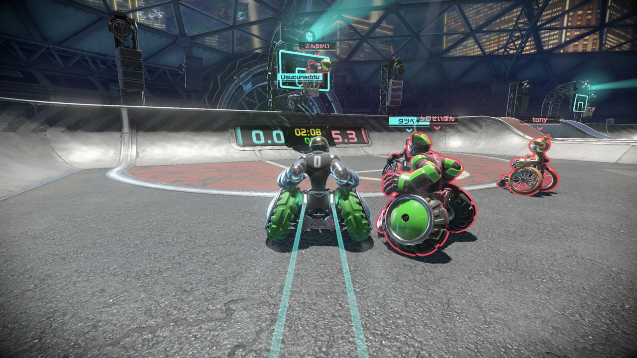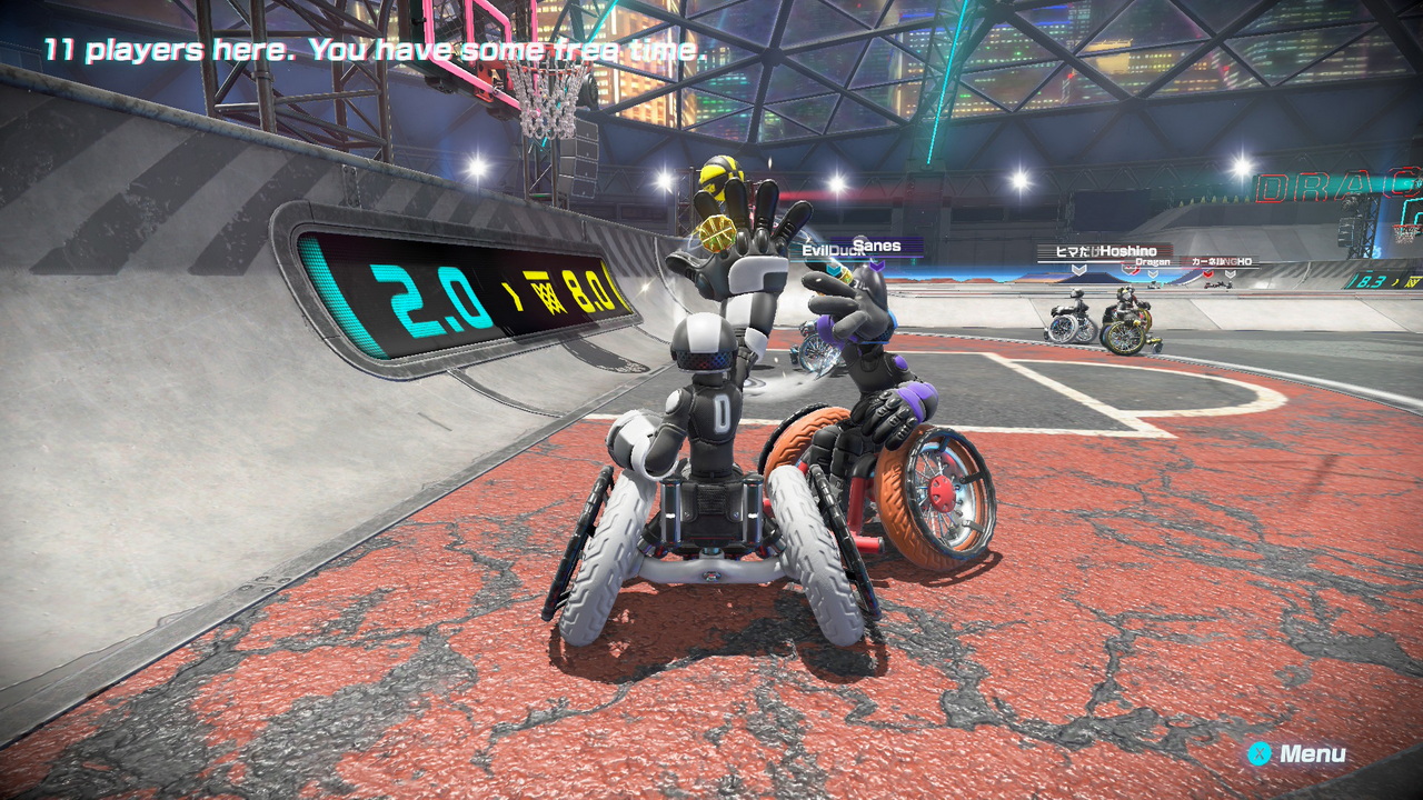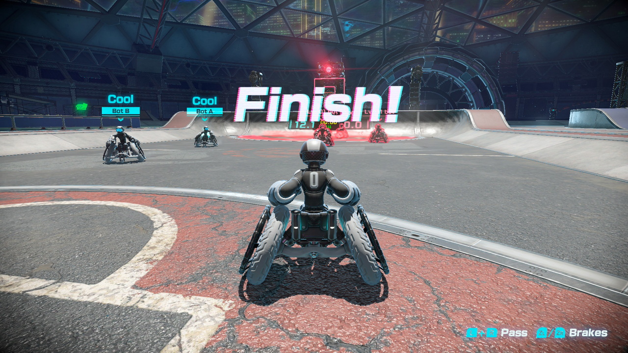 Αφού τελειώσαμε με το αρκετά λεπτομερές tutorial, ήρθε η στιγμή να βολτάρουμε στο μεγάλο εσωτερικό στάδιο κάνοντας διάφορα trials. Πρόκειται για τεστ δεξιοτήτων, φυσικά με χρόνο, τα οποία έχουν μεγάλη γκάμα: από γρήγορες κινήσεις και σλάλομ μέχρι μικρές διαδρομές μετ’ εμποδίων. Τα συγκεκριμένα single player trials είναι αρκετά απαιτητικά, αλλά βοηθούν αρκετά ώστε να μπορέσει κανείς να καταλάβει καλύτερα τη λογική του Drag x Drive. Στο online κομμάτι, το Drag x Drive προσπαθεί να χτίσει το βασικό του πλεονέκτημα. Οι αγώνες 3v3 είναι γρήγοροι, έντονοι και απαιτούν πραγματική συνεργασία ανάμεσα στους παίκτες. Όταν η ομάδα συνεννοηθεί, το παιχνίδι δείχνει το καλύτερό του πρόσωπο: πάσες που βγαίνουν ακριβώς την ώρα που πρέπει, αιφνιδιασμοί που κρίνουν τον αγώνα και μια αίσθηση ρυθμού που κάνει κάθε ματς να κυλάει νεράκι. Είναι εμφανές ότι οι developers ποντάρουν πολλά στο ομαδικό στοιχείο, και αυτό είναι θετικό. Ακόμη και το matchmaking στις περισσότερες περιπτώσεις βρίσκει αγώνες σχετικά γρήγορα, κάτι που μας δίνει ελπίδα για μια γεμάτη κοινότητα.