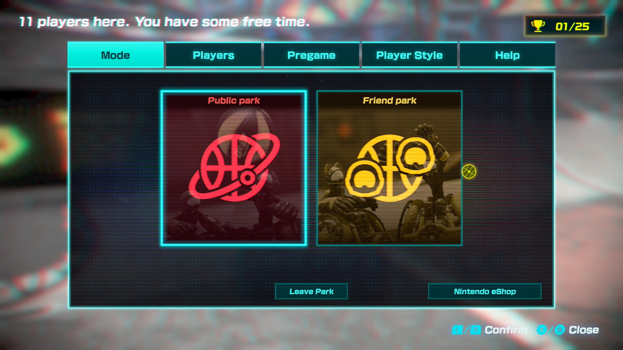 Τα lobbies μπορούν να φιλοξενήσουν έως και δώδεκα παίκτες, και μέσα στο Park μπορούμε να κυκλοφορούμε ελεύθερα. Αν παίζουμε με τυχαίους παίκτες, κάθε λίγα λεπτά ξεκινούν νέοι αγώνες. Επειδή στο Park υπάρχουν δύο ίδιες αρένες, οι δώδεκα παίκτες χωρίζονται σε δύο ματς 3v3. Το πρόβλημα όμως παραμένει: όταν ξεκινάει ένα ματς, δεν μπορούμε να είμαστε σίγουροι ότι θα βρεθούμε στην ίδια ομάδα με τον φίλο μας. Αυτό πιθανότατα γίνεται για να αποφευχθούν υπερδυνατές ομάδες, αλλά θα μπορούσε πολύ απλά να υπάρχει ένα team queue. Θεωρητικά, λοιπόν, οι παίκτες δεν μπορούν καν να είναι σίγουροι ότι θα παίξουν μαζί στην ίδια ομάδα, καθώς τρέχουν ταυτόχρονα δύο ματς 3v3 και η τοποθέτηση γίνεται εντελώς τυχαία.