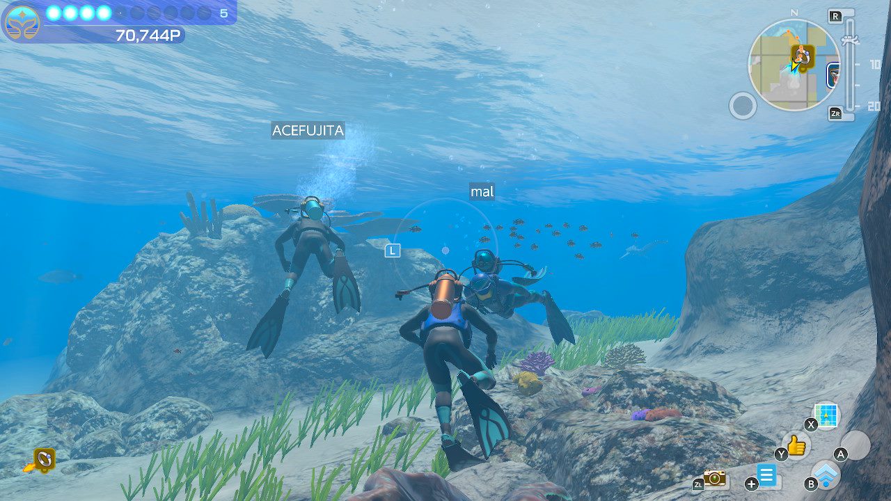 Φυσικά υπάρχει και το Shared Dives, ένα διαδικτυακό mode που ουσιαστικά προσφέρει μία multiplayer εμπειρία η οποία ήταν απροβλημάτιστη. Στην αρχή φοβηθήκαμε ότι θα υπάρξει η ίδια κατάσταση με το Advance Wars 1+2: Re-Boot Camp, όπου θα μπορούν να συνεργαστούν τα άτομα μόνο υπό συγκεκριμένες συνθήκες, invitation system κτλ. Δόξα τον Θεό, στο Endless Ocean Luminous μπορούμε απλώς να ξεκινήσουμε ένα shared dive και να συνεργαστούμε με πολλούς random παίκτες, ώστε να εξερευνήσουμε μαζί τα βάθη της θάλασσας και να ανακαλύψουμε σπάνια πλάσματα. Μάλιστα υπάρχουν και events σε συγκεκριμένες ημερομηνίες, όπου οι παίκτες θα έχουν μεγαλύτερες πιθανότητες να ανακαλύψουν σπάνια και μυθικά ψάρια. Το παιχνίδι παραμένει προφανώς χαλαρό και σε online περιβάλλον, αφού τα missions ουσιαστικά στοχεύουν σχεδόν αποκλειστικά στην αναζήτηση νέων πλασμάτων. Σίγουρα θα θέλαμε μία πιο πλούσια επικοινωνία μεταξύ των παικτών, μιας και υπάρχει μόνο το tagging system με τα stickers όπου μπορούμε να μαρκάρουμε θησαυρούς, σημεία, ψάρια και φυσικά υπάρχει και η αλληλεπίδραση μέσω emoticons. Τουλάχιστον είδαμε έναν ιδιαίτερα βοηθητικό χάρτη, την δυνατότητα να μεταφερθούμε στις θέσεις άλλων παικτών και ένα πραγματικά απροβλημάτιστο online περιβάλλον ακόμη και όταν κολυμπήσαμε μαζί με εννέα άλλα άτομα. Αξίζει να αναφερθεί ότι υπάρχει ένας χρονικός περιορισμός όταν βουτάμε μαζί με άλλους παίκτες στη θάλασσα, ο οποίος όμως διαρκεί μία ολόκληρη ώρα, κάτι που θεωρούμε υπεραρκετό.