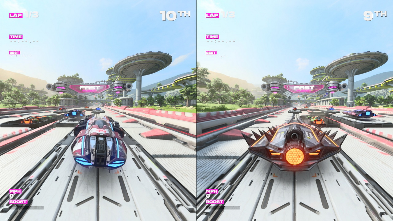 Η Shin’en Multimedia φαίνεται να κουβαλά έναν μυστικό πόθο: να φτιάξει επιτέλους ένα F-Zero. Δεν εξηγείται αλλιώς η εμμονή της με τα futuristic pod racers. Το Fast Fusion ήρθε με φόρα στο Nintendo Switch 2, αλλά με τη βαριά σκιά του Mario Kart World να αιωρείται από πάνω του, κινδυνεύει να μην πάρει την εμπορική ώθηση που του αξίζει. Κι όμως, οι δύο αυτοί τίτλοι όχι μόνο μπορούν, αλλά πρέπει να συνυπάρχουν στη νέα κονσόλα της Nintendo, αφού προσφέρουν εντελώς διαφορετικές εμπειρίες: από τη μία οι χαρακτήρες του Mario και οι χαμηλές ταχύτητες των καρτ, από την άλλη γιγάντια οχήματα που μοιάζουν με διαστημόπλοια και τρέχουν με ιλιγγιώδεις ταχύτητες.