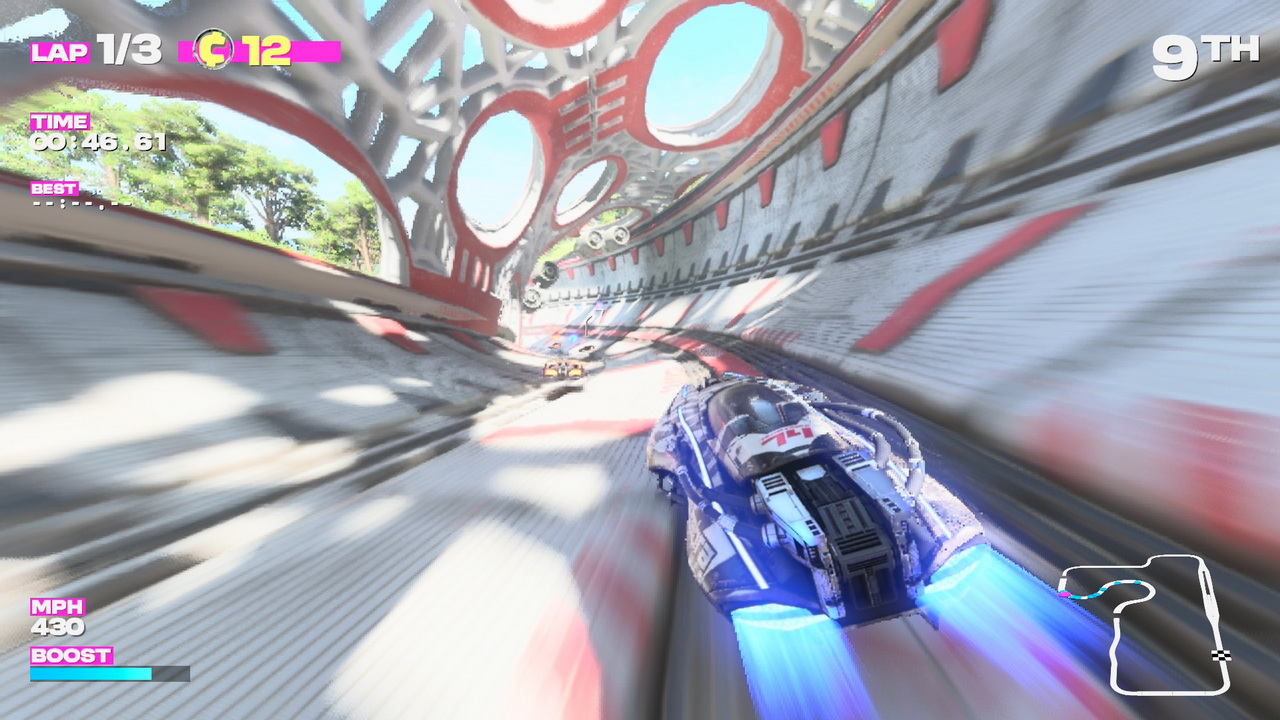 Το Pure 1.3 update ήρθε να διορθώσει ακριβώς αυτό: εισάγοντας το νέο Pure rendering mode, το παιχνίδι πλέον αποδίδεται χωρίς κανένα είδος upscaling. Σε docked λειτουργία, η εικόνα τρέχει σε native dynamic ανάλυση έως 1440p, ενώ στο handheld mode αγγίζει native 1080p, πάντα στα 60 καρέ. Η διαφορά στην καθαρότητα της εικόνας είναι ορατή, ειδικά στις υψηλές ταχύτητες, προσφέροντας μία εμπειρία πολύ πιο κοντά σε αυτήν που χρειαζόταν το art direction του τίτλου. Το Fast Fusion αποφεύγει τη γνωστή λογική με items που χτυπούν αντιπάλους. Εστιάζει στη διαχείριση του boost, στην αποφυγή εμποδίων και σε ένα νέο σύστημα που ονομάζεται Hyperjump. Πρόκειται για μια εκτόξευση μεγάλης εμβέλειας που επιτρέπει στο όχημα να διανύσει τεράστιες αποστάσεις στον αέρα - ένα στοιχείο που δίνει ουσιαστικό βάθος στις πίστες και ανοίγει την πόρτα για κρυφά shortcuts. Αρκετές από αυτές τις παρακάμψεις είναι έξυπνα κρυμμένες, απαιτούν καλό timing και ανταμείβουν τον παίκτη με σημαντικό στρατηγικό πλεονέκτημα, ειδικά όταν κυνηγά την πρώτη θέση. Όλα αυτά προσφέρουν βάθος στις πίστες, κάτι που βοηθά σημαντικά το replayability των levels.