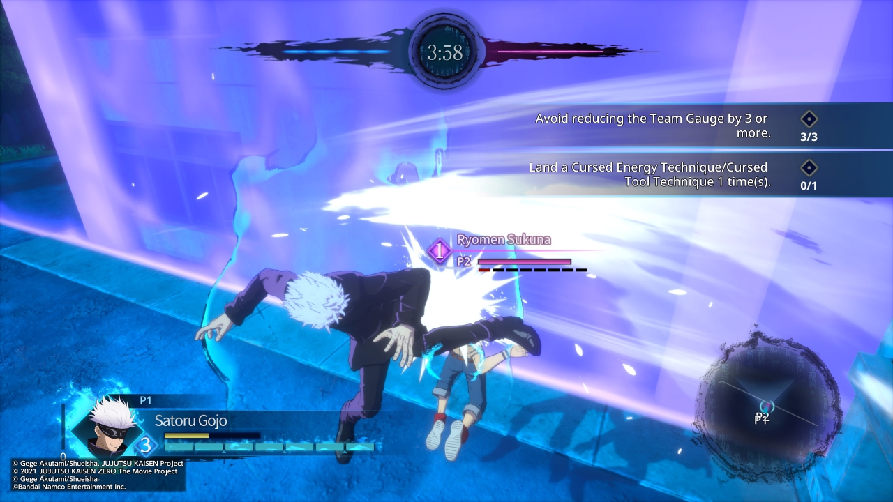 Με τα άλλα δύο πλήκτρα (τρίγωνο και κύκλο) εκτελούνται launches και knockdowns αντίστοιχα, χτίζοντας πιο εύκολα το Curse Meter, ενώ με το Χ γίνονται άλματα. Στα R1/R2 βρίσκονται οι ειδικές τεχνικές κάθε χαρακτήρα, οι οποίες απαιτούν Curse Meter, οπότε η στρατηγική χρήση τους είναι υψηλής σημασίας καθώς εύκολα ο παίκτης μπορεί να βρεθεί εκτεθειμένος και μόνο το block/dodge (L2) τον σώζει. Δεν είναι όλες οι επιθέσεις εξίσου αποδοτικές κι αυτό είναι θετικό – ζημιά στο HP του αντιπάλου κάνουν μόνο οι κινήσεις που χρησιμοποιούν Curse Energy, δηλαδή τετράγωνο και Cursed Techniques. Ενδιαφέρουσα ιδέα, μέτρια υλοποίηση, αφού ένας συνδυασμός των δύο είναι πιο αποδοτικός στη μάχη από τη χρήση Extractor attacks (τρίγωνο/κύκλος) για χτίσιμο του Curse Meter. Γιατί ο παίκτης να ρισκάρει επιθέσεις που απλώς αυξάνουν το Curse Meter, αντί για επιθέσεις που κάνουν το ίδιο συν ζημιά στο HP; Τουλάχιστον, οι Cursed Techniques είναι φαντασμαγορικές και οι φίλοι της σειράς θα τις εκτιμήσουν όσο συχνά κι αν συμβαίνουν, ιδίως αφού υπάρχει προσοχή στη λεπτομέρεια. Το Domain Expansion του Gojo, για παράδειγμα, είναι μια τεχνική που παίρνει λίγα δευτερόλεπτα για τα οποία παραμένει απροστάτευτος, όμως όταν ολοκληρωθεί, το αποτέλεσμα είναι καταστροφικό (για τον εχθρό). Οι μάχες μπορούν να κρατήσουν ακόμη και λίγα δευτερόλεπτα, αν ο παίκτης χτίσει γρήγορα Curse Meter και ευστοχήσει με κάθε Cursed Technique ή χρησιμοποιήσει ένα Awakened Technique (L2+R2). Υπάρχει ένα όριο 5 λεπτών στις μάχες του Story Mode, για παράδειγμα, όμως σπάνια εξαντλήθηκε ο χρόνος.