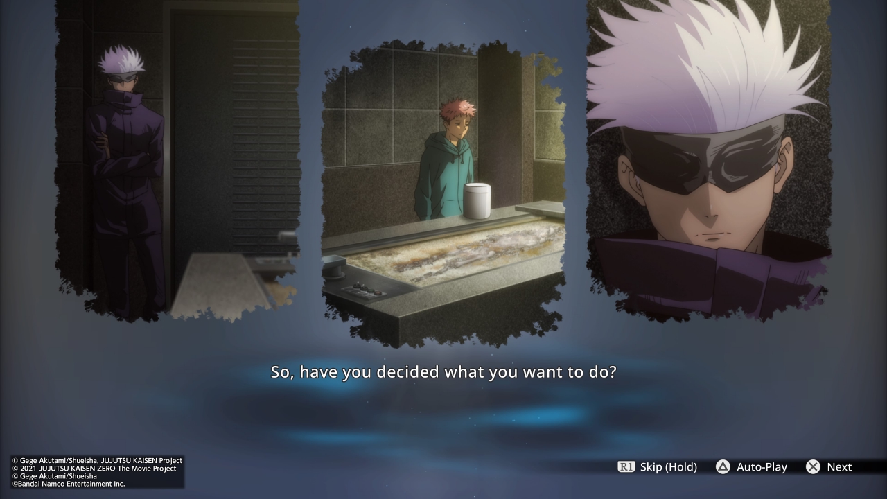 Και πώς αφηγούνται μια τέτοια, δυναμική ιστορία οι δημιουργοί; Με έναν τρόπο που «σκοτώνει» κάθε δείγμα αδρεναλίνης. Το “Story Mode” είναι μια σειρά από μάχες, οι οποίες συνδέονται από cutscenes τα οποία είναι -κυριολεκτικά- screenshots από σκηνές anime με κείμενο και ομιλία να τα συνοδεύει. Στατικές εικόνες χρησιμοποιούνται παράλληλα με φωνητικές αφηγήσεις για να αποτυπώσουν από τα πιο ασήμαντα έως τα πιο καταστροφικά γεγονότα. Ακόμη και παιχνίδια τύπου visual novel έχουν καταφέρει να αποδώσουν καλύτερα το συναίσθημα και τις εκφράσεις των χαρακτήρων, από ότι συμβαίνει εδώ. Θα μπορούσαν να δανειστούν σκηνές από τη σειρά -η οποία έχει φανταστικής ποιότητας animation- ή έστω, ολόκληρες σελίδες από το manga, όμως προτίμησαν την χειρότερη δυνατή εναλλακτική ίσως λόγω κόστους. Χώρια της φτωχής παρουσίασης, γίνονται περικοπές σε γεγονότα και χτίσιμο χαρακτήρων, οπότε η ιστορία θα αφήσει κενά σε άτομα που δεν έχουν επαφή με το πηγαίο υλικό. Κι όταν η μισή γοητεία του Jujutsu Kaisen βρίσκεται στους χαρακτήρες, είναι τεράστια αμαρτία να συμβαίνει αυτό.