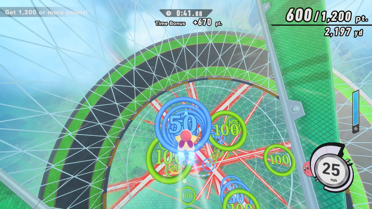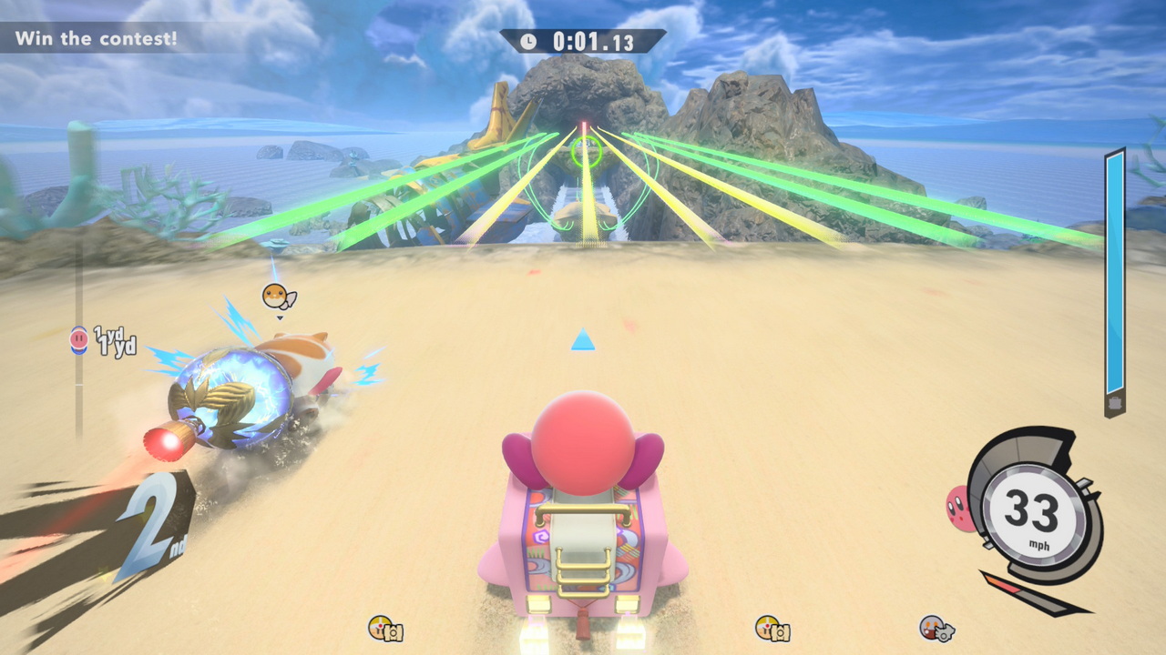 Το Β το κρατάμε πατημένο για να φορτώσουμε τη μηχανή μας και να το αφήσουμε ώστε να φύγει το όχημά μας με ορμή από ένα boost, όπου την ώρα της φόρτισης το όχημα οριακά φρενάρει. H χρήση του boost είναι απαραίτητη για drifting — σε μία κοφτή στροφή κόβουμε ταχύτητα μέσω του boost και με το άφημα του κουμπιού εκτοξευόμαστε στην ευθεία. Στην αρχή μας φάνηκε περίεργο το πόσο απότομα κόβει το όχημα για να φορτίσει, αλλά στην πορεία αποκτά τη δική του ροή. Τα υπόλοιπα κουμπιά έχουν την λειτουργία του να καταπιούμε έναν αντίπαλο και, ανάλογα με το ability που κάναμε copy, να εκτοξεύουμε projectiles. Την μοναδική κίνηση που δεν μπορέσαμε να αγαπήσουμε όσο τις υπόλοιπες ήταν το spin attack, το οποίο επιτυγχάνεται όταν κουνήσουμε τον μοχλό κίνησης γρήγορα δεξιά και αριστερά. Δεν είναι ότι δεν λειτουργεί, λειτουργεί άμεσα. Είναι ότι σε racing περιβάλλον δεν είναι τόσο βολικό στην εκτέλεση. Αντίθετα σε εντελώς διαφορετικά modes όπου σκοπός είναι να χτυπήσουμε τον αντίπαλο και να προκαλέσουμε damage, εκεί λειτουργεί πολύ καλύτερα. Προσέξαμε ότι ακόμα και σε υψηλό βαθμό δυσκολίας, προτιμήσαμε σε Air Ride και Top Ride να μη το χρησιμοποιούμε τόσο συχνά, γιατί αν δεν πετύχει χάνουμε περισσότερα απ’ όσα κερδίζουμε.