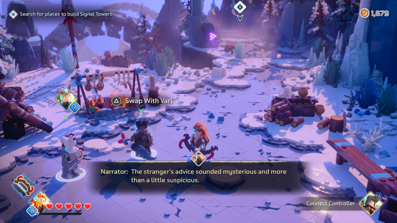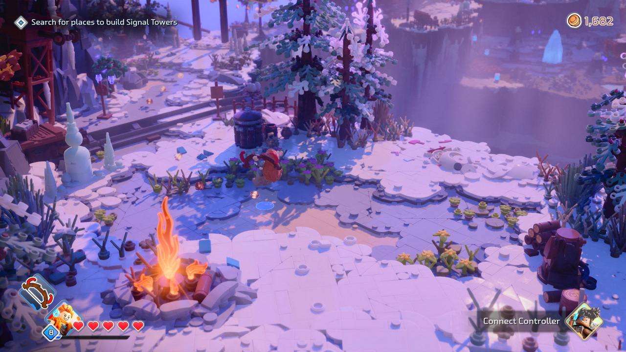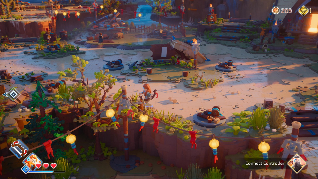 Με την ολοκλήρωση του Tutorial, μπορέσαμε να ξεκινήσουμε να παίζουμε couch coop, με τον έναν παίκτη να καθοδηγεί την Aloy και τον δεύτερο τον Rost. Οι δυνάμεις που κατέχουν οι δυό τους, είναι ολόιδιες. Στην πορεία όμως, ο παίκτης μπορεί να ξεκλειδώσει τρεις ακόμη playable χαρακτήρες, τους Varl, Teersa και Erend, οι οποίοι έχουν διαφορετικό όπλο ο καθένας και μπορούν να αλληλεπιδράσουν με διαφορετικούς τρόπους με τους εχθρούς. Κάθε χαρακτήρας έχει δική του μπάρα εμπειρίας και ξεκλειδώνονται διαφορετικές δυνάμεις για τον καθένα, εμπλουτίζοντας το σύστημα μάχης. Η διαφορετικότητα των τεσσάρων (πέντε αν θεωρήσουμε τον Rost extra χαρακτήρα με τα ίδια skills με την Aloy) χαρακτήρων, ωθεί το σύστημα coop. Ο τίτλος μπορεί να παιχτεί από έναν παίκτη, ή συνεργατικά με δύο παίκτες είτε στο ίδιο σύστημα με δύο χειριστήρια, είτε online. Η κάμερα που έχει επιλεγεί για το LEGO Horizon Adventures, είναι ισομετρική και θεωρούμε πως είναι ολόσωστη επιλογή. Οι πίστες είναι μικρές, αλλά όμορφα σχεδιασμένες, με το ύφος του Horizon να λάμπει και να ταιριάζει απόλυτα στην καλλιτεχνική κατεύθυνση των LEGO. Υπάρχουν μικρά παράπλευρα μονοπάτια τα οποία αν ο παίκτης ανακαλύψει, θα επιβραβευτεί με έξτρα τουβλάκια.